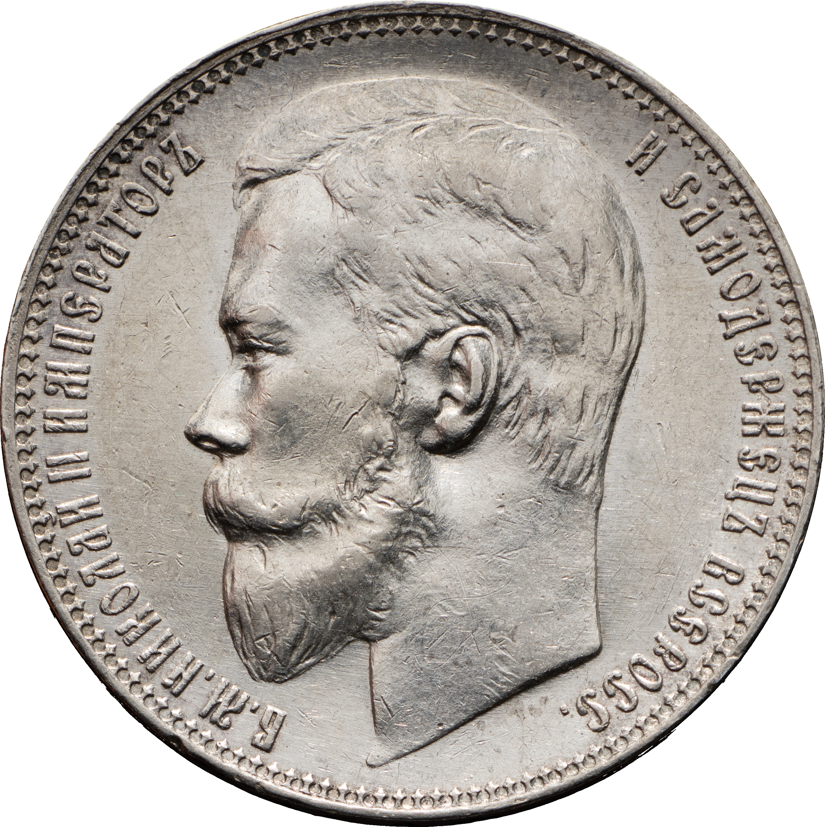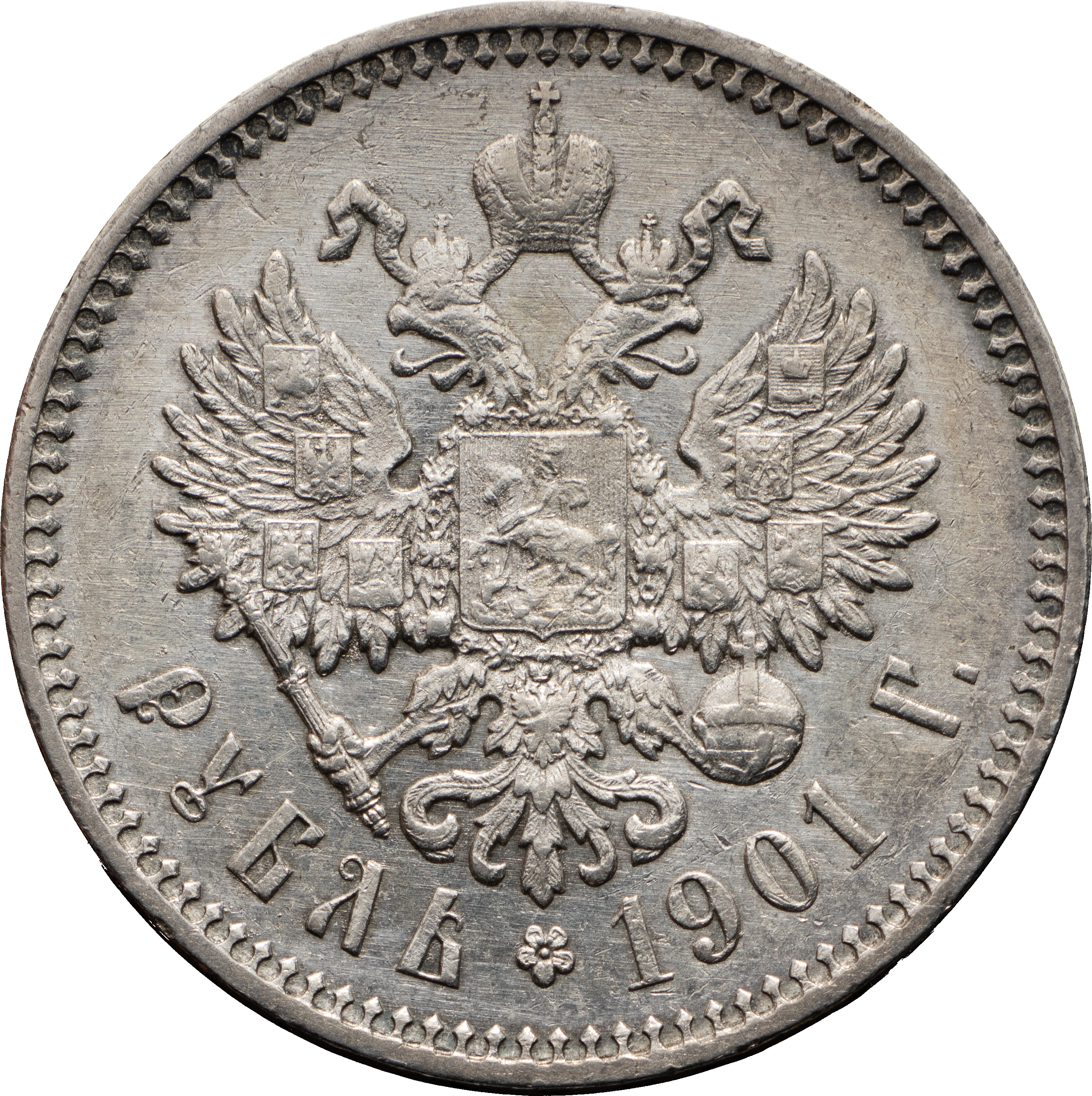 1 рубль 1901 года, АГ-ФЗ. Лиц. ст.: портрет образца 1900 г. Серебро, 19,98 г. Сохранность почти отличная, мелкие царапины, следы чистки. Severin# 4093 (точка). Уздеников# 2117. Биткин# 53. Казаков# 224.