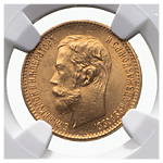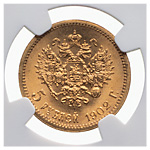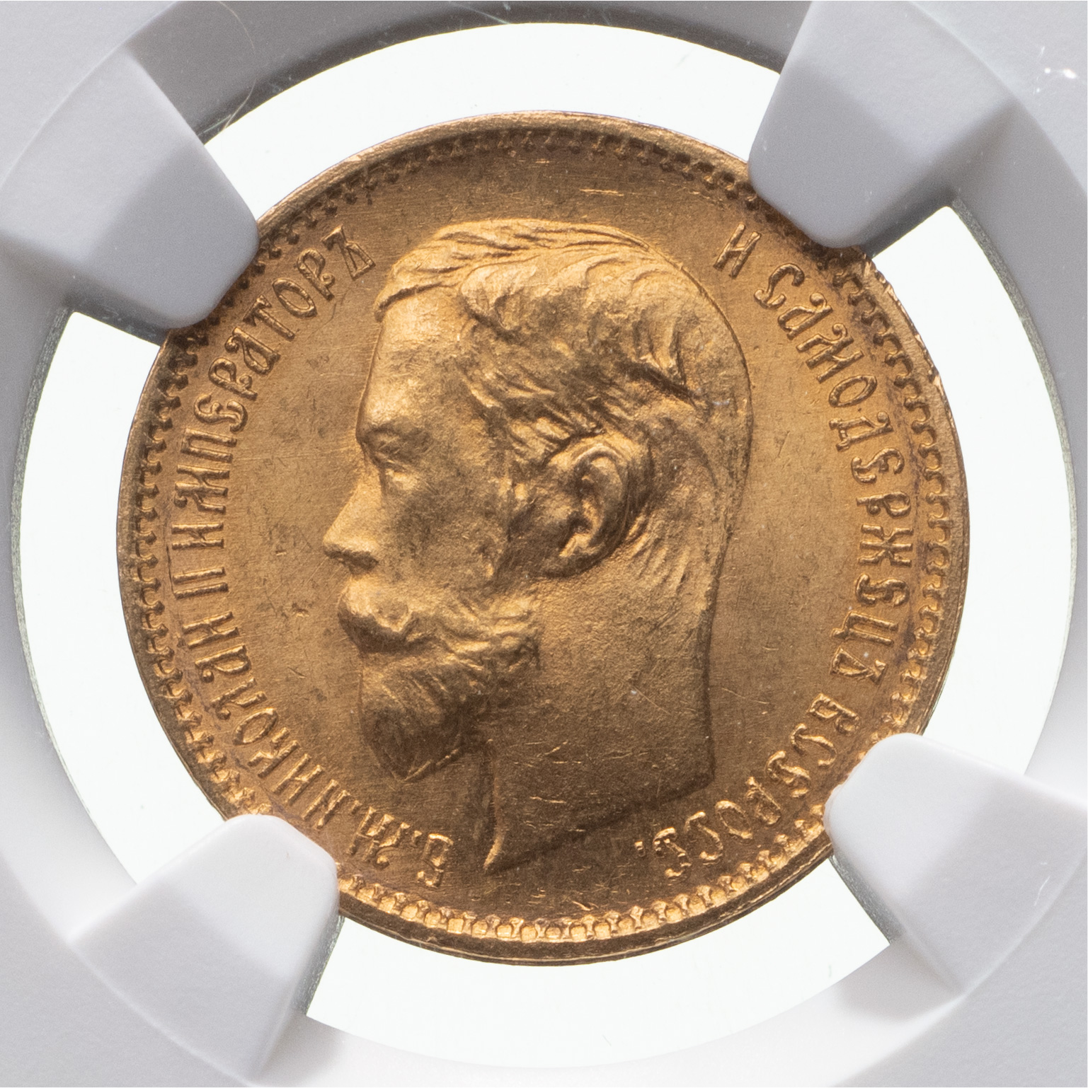 5 рублей 1902 года, АР. Золото. Монета в пластиковой капсуле (слабе) NGС, MS 66. Severin# 576. Уздеников# 0344. Биткин# 29. Казаков# 252.