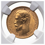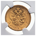 5 рублей 1903 года, АР. Золото. Монета в пластиковой капсуле (слабе) NGС, MS 66. Severin# 579. Уздеников# 0346. Биткин# 30. Казаков# 268.