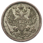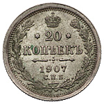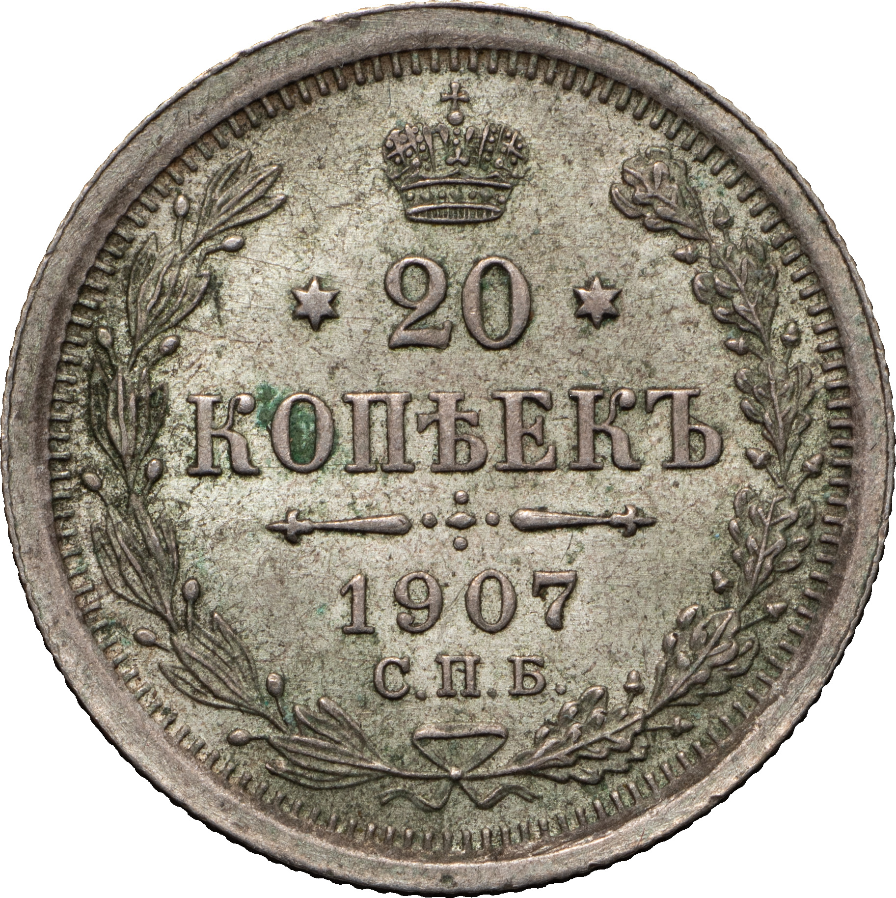 20 копеек 1907 года, СПБ-ЭБ. Серебро, 3,53 г. Сохранность почти отличная, густая приятная патина. Severin# 4127 (точка). Уздеников# 2161. Биткин# 107. Казаков# 328.