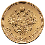 10 рублей 1909 года, АГ-ЭБ. Золото, 8,58 г. Сохранность отличная, приятная лёгкая патина, мелкие царапины. Severin# 589 (точка). Уздеников# 0352 (черта). Биткин# 14 (R). Казаков# 359. Довольно редкие.