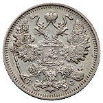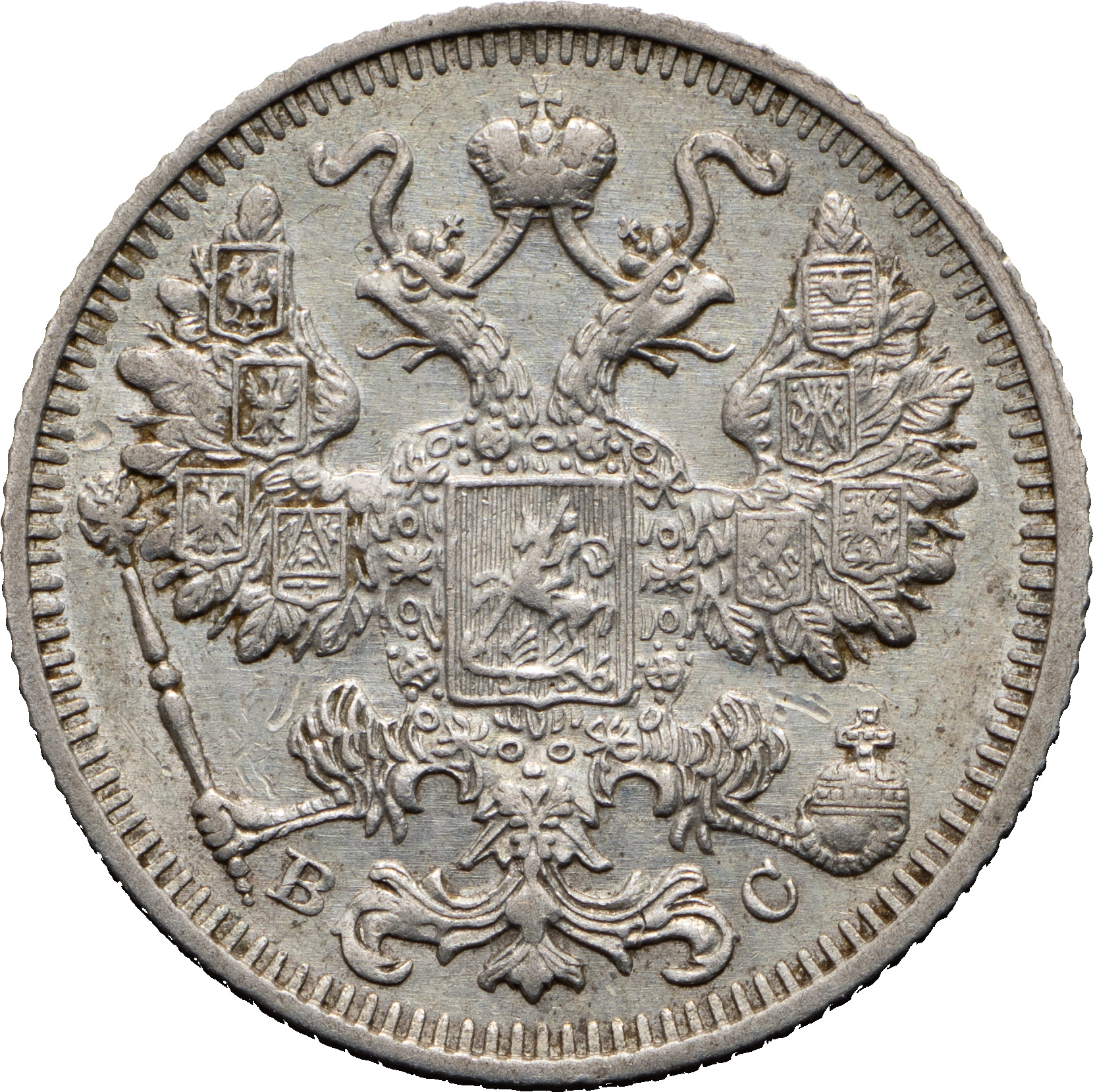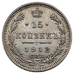 15 копеек 1912 года, ВС. Серебро, 2,64 г. Сохранность почти отличная, приятная лёгкая патина. Severin# 4158 (черта). Уздеников# 2192 (точка). Биткин# 138 (R3). Казаков# 421. Очень редкие.