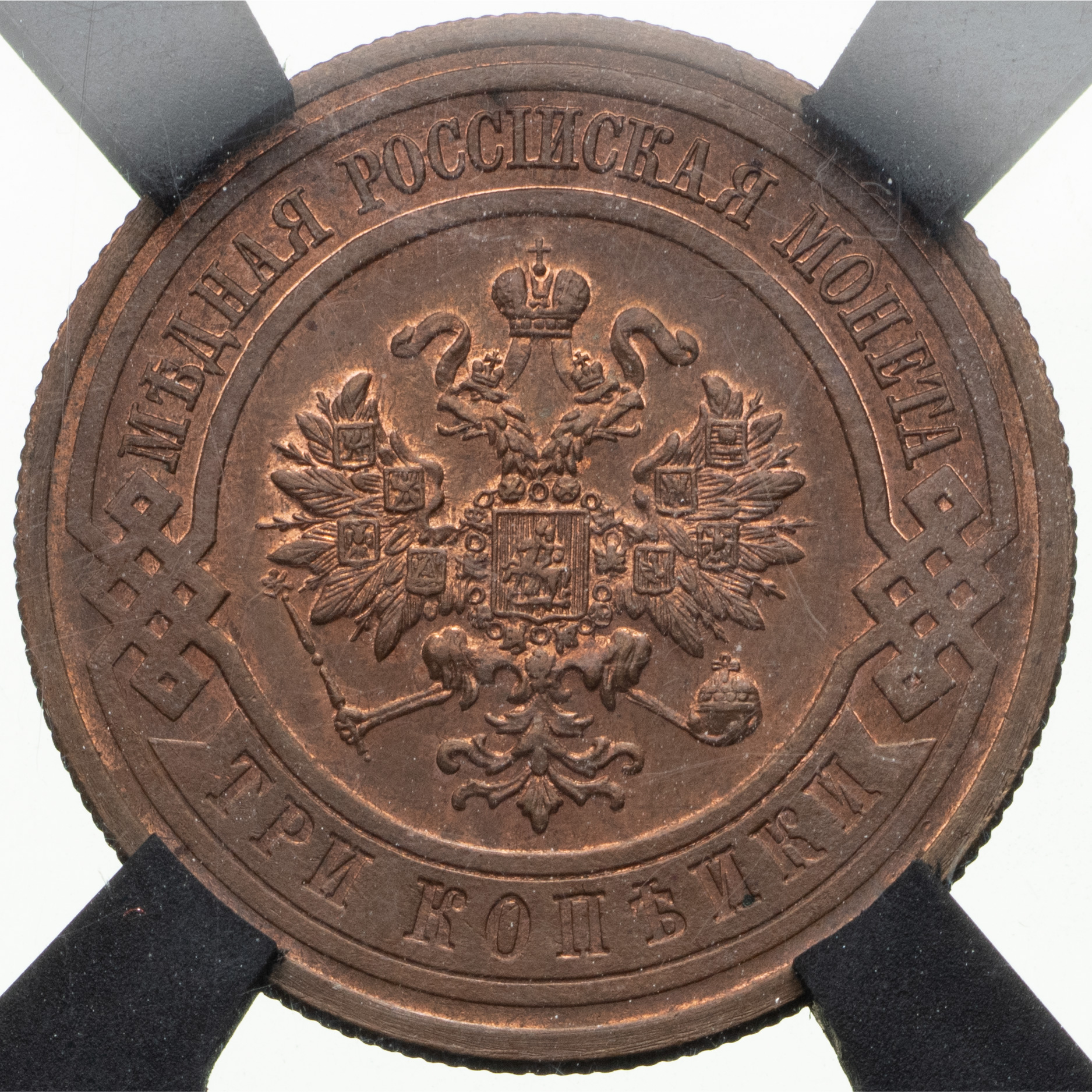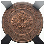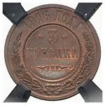 3 копейки 1916 года. Медь. Монета в пластиковой капсуле (слабе) RNGA PF 64 BN. Brekke# 93. Уздеников# 3954. Биткин# 229. Казаков# 501.