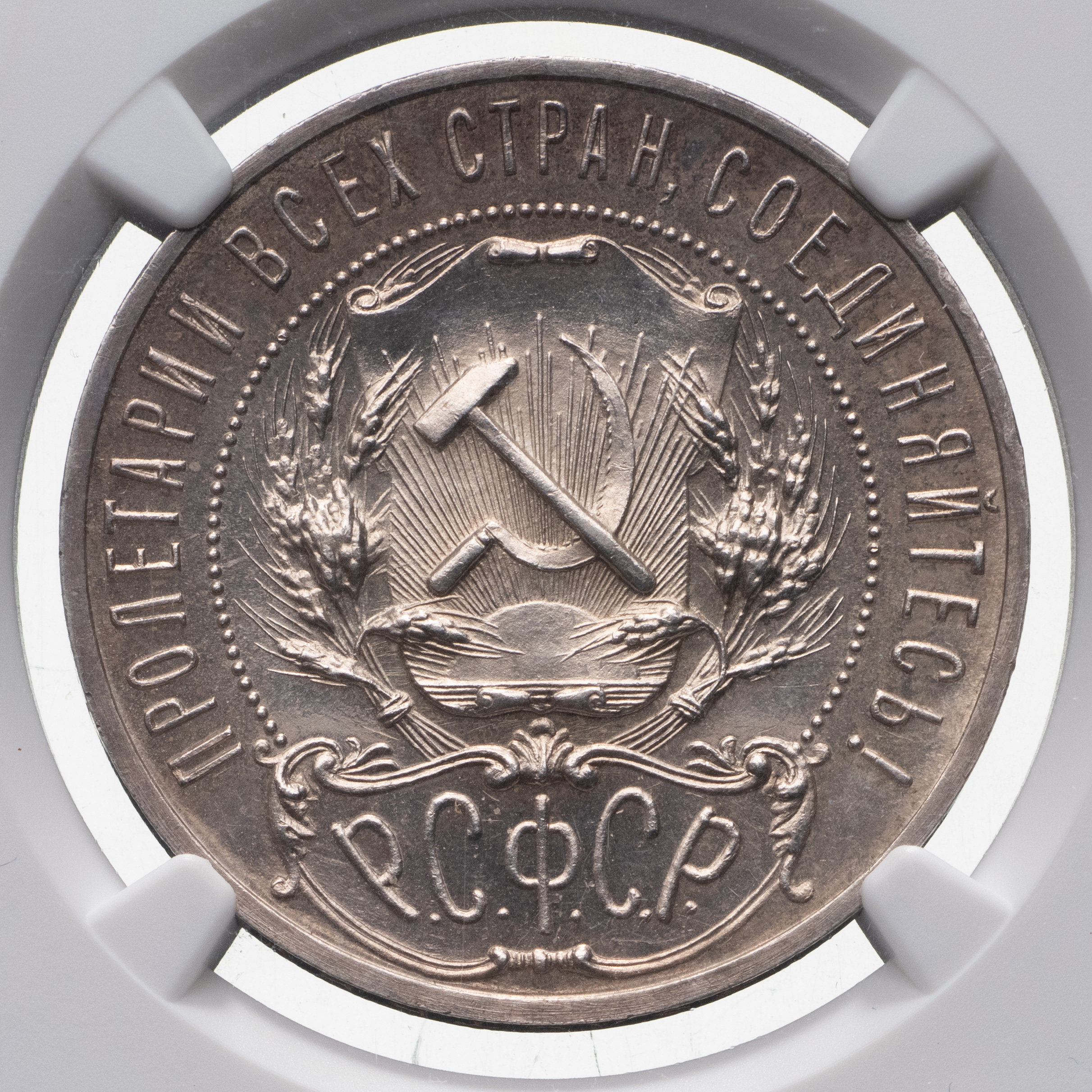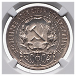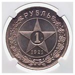 1 рубль 1921 года, АГ. Полированный чекан. Лиц. ст.: шт.1.2 — с полуточкой. Серебро. Монета в пластиковой капсуле (слабе) NGC, PF 65. Петров, Федорин# 1 (Р-2). ФедоринVI# 2 (П). Очень редкий.