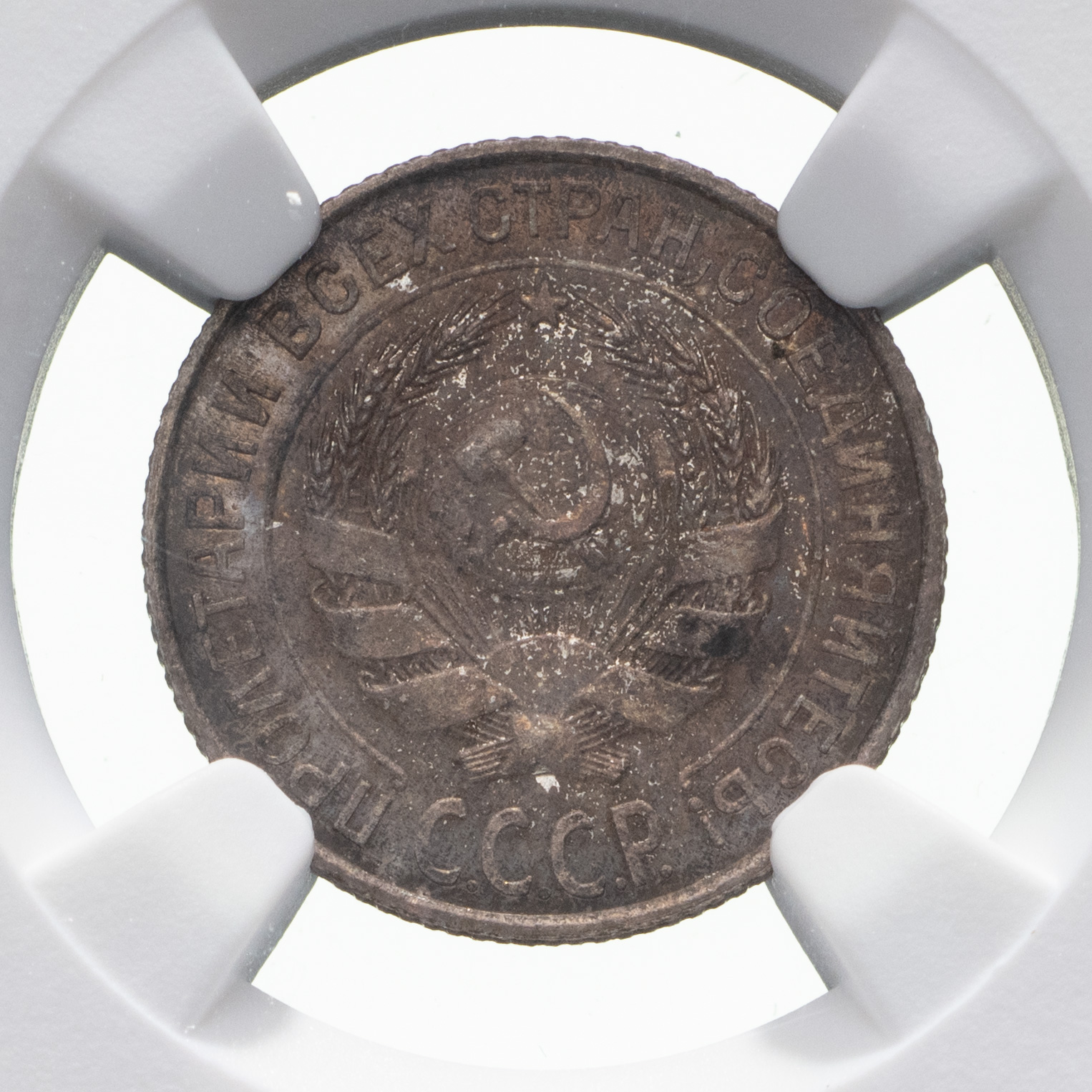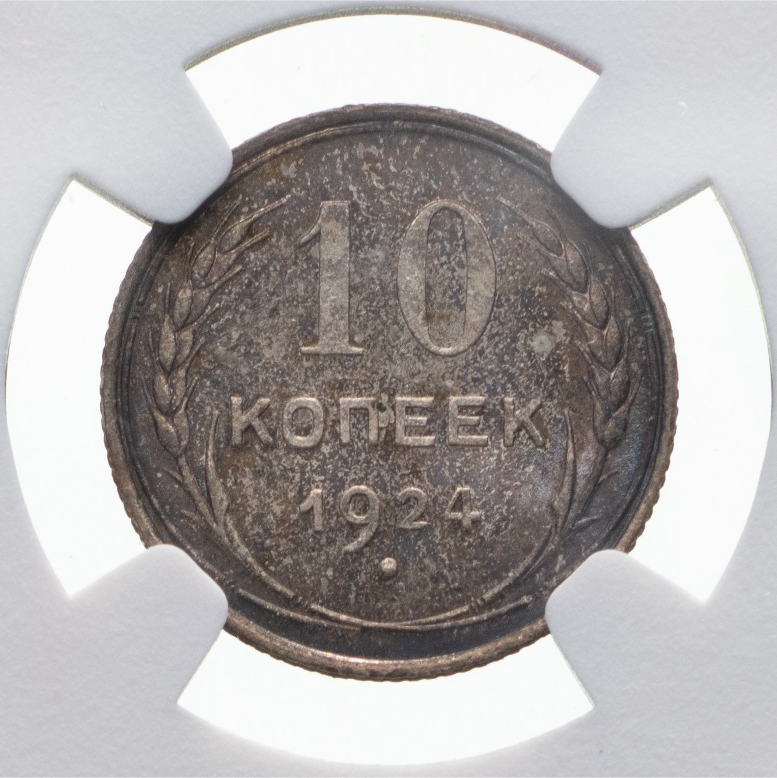 10 копеек 1924 года. Серебро. Монета в пластиковой капсуле (слабе) NGС, PF 62. ФедоринVI# 4 (П). Петров, Федорин# 23 (Р-1). Редкие.