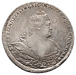 1 рубль 1738 года. Лиц. ст.: портрет работы Л.Дмитриева. В слове «ИМПЕРАТРИЦА», буквы «Е» и «Р», набиты пуансоном в виде развернутой буквы «Ч», но не завершены. Об. ст.: цифры даты сближены. Серебро, 25,75 г. Сохранность очень хорошая, чистка, коррозия, штемпельный блеск. ГМ# 12.14. Severin# 1274. Уздеников# 0736. Дьяков# 4. Биткин# 202. Довольно редкий, 3 рубля по Петрову.