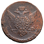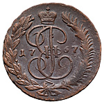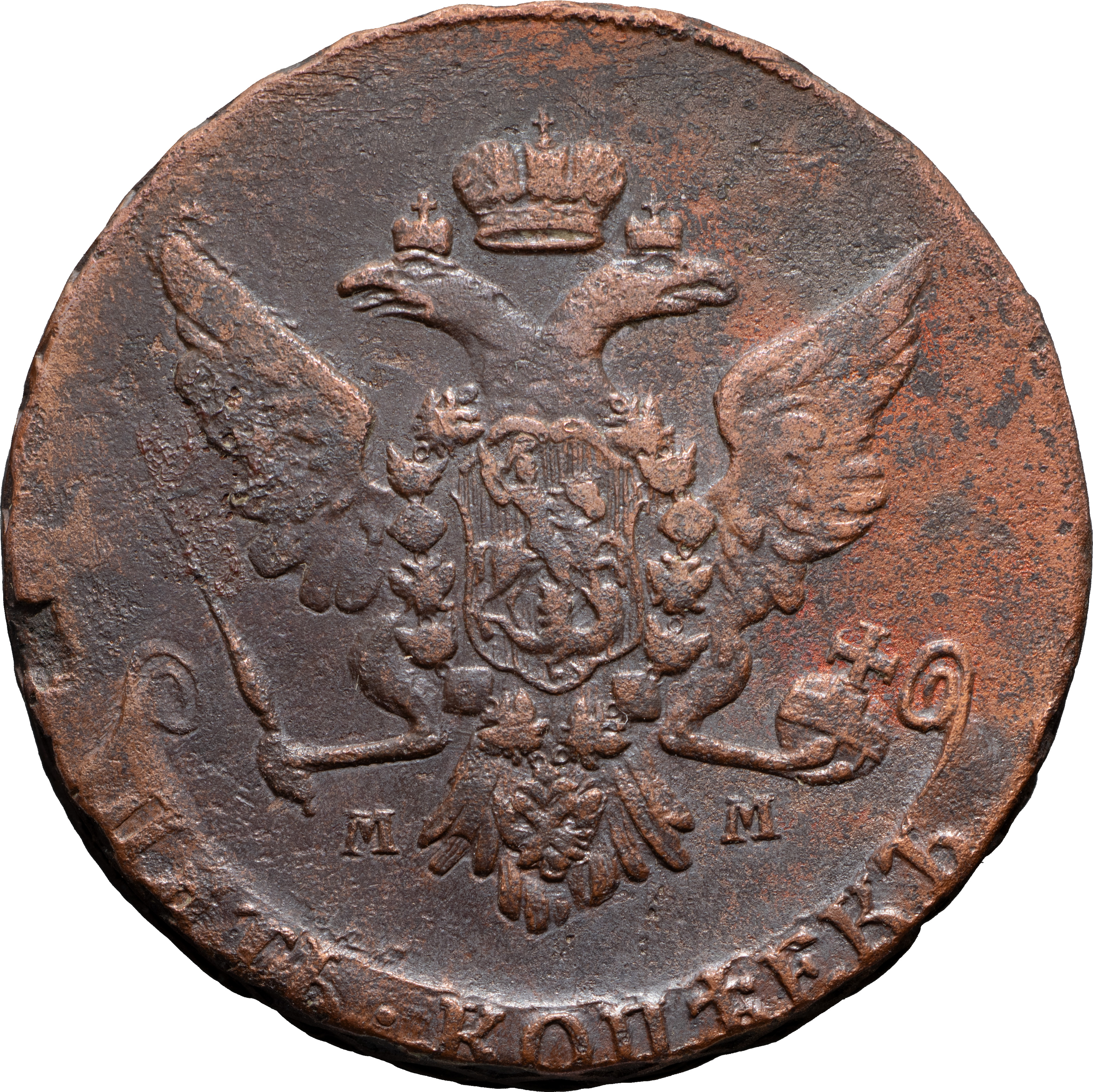 5 копеек 1767 года, ММ. Медь, 55,03 г. Сохранность почти отличная, дефекты заготовки, следы чистки. ГМ# 7.20 (довольно редкая). Brekke# 219 (черта). Уздеников# 2691 (точка). Дьяков# 176 (R2). Биткин# 525 (R1). Очень редкие, 5 рублей по Ильину.