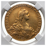 10 рублей 1768 года, СПБ-ТI. Лиц.ст.: портрет узкий. Золото. Монета в пластиковой капсуле (слабе) ННР, AU 50. ГМ# 8.17. Severin# 291 (черта). Уздеников# 0120 (точка). Дьяков# 190 (R1). Биткин# 18 (R). Редкие, 20 рублей по Ильину, 22 рубля по Петрову.