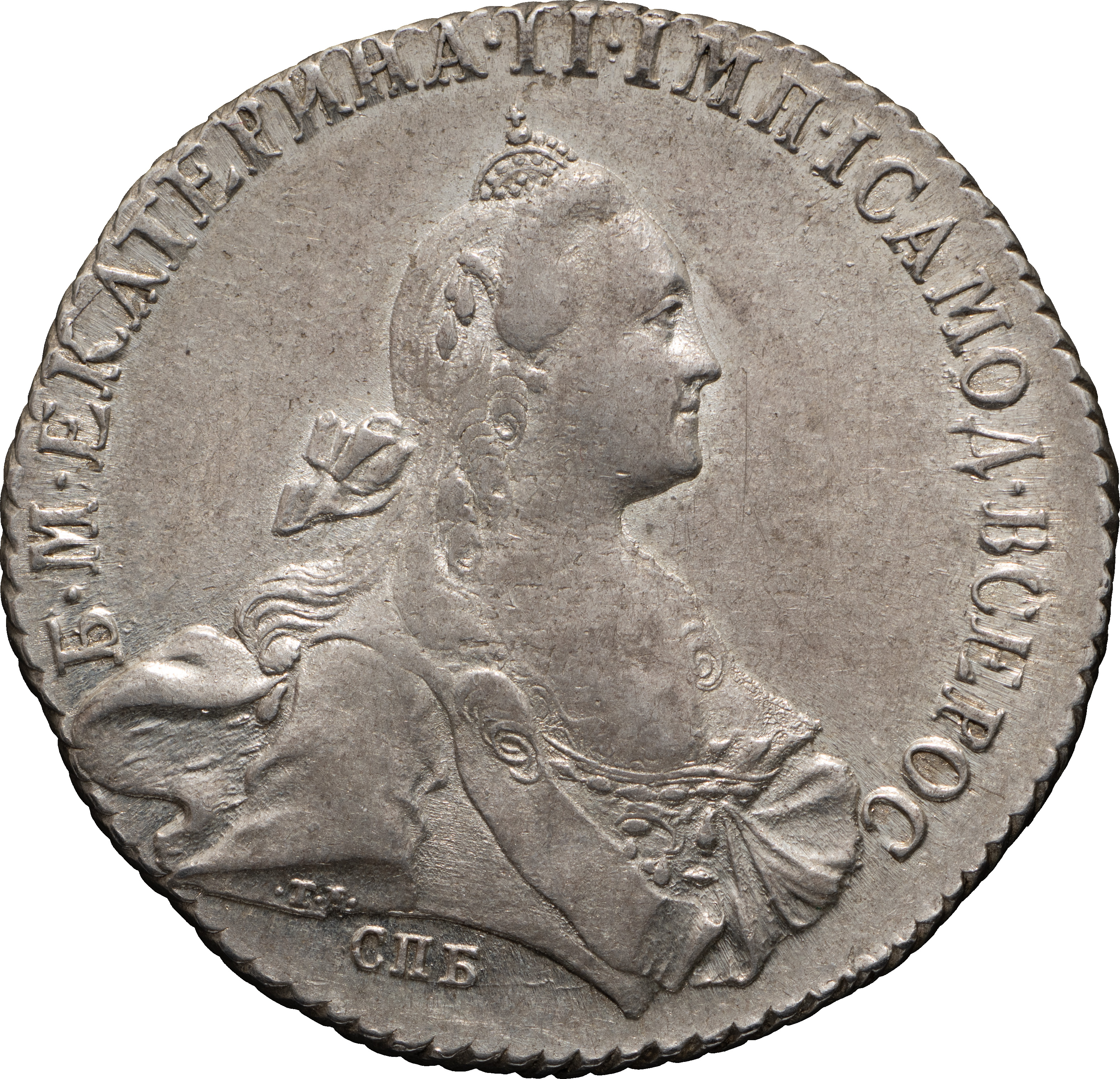 1 рубль 1770 года, СПБ-TI-ЯЧ. Серебро, 23,84 г. Сохранность почти отличная, лёгкая патина, небольшой дефект заготовки. ГМ# 11.15. Severin# 2043. Уздеников# 1030. Дьяков# 245. Биткин# 209. 2 рубля 50 копеек по Петрову.