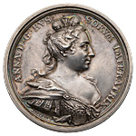 1 рубль 1735 года. Лиц. ст.: портрет с кулоном из трёх жемчужин на груди, девять жемчужин в волосах. Серебро, 25,63 г. Сохранность отличная, густая патина, небольшая реставрация фрагментов рельефа. ГМ# нет. Severin# 1209. Уздеников# 0723. Дьяков# 7, вар. Биткин# 122, вар. Полуйко# 35.5, 366, вар. 2 рубля по Петрову.