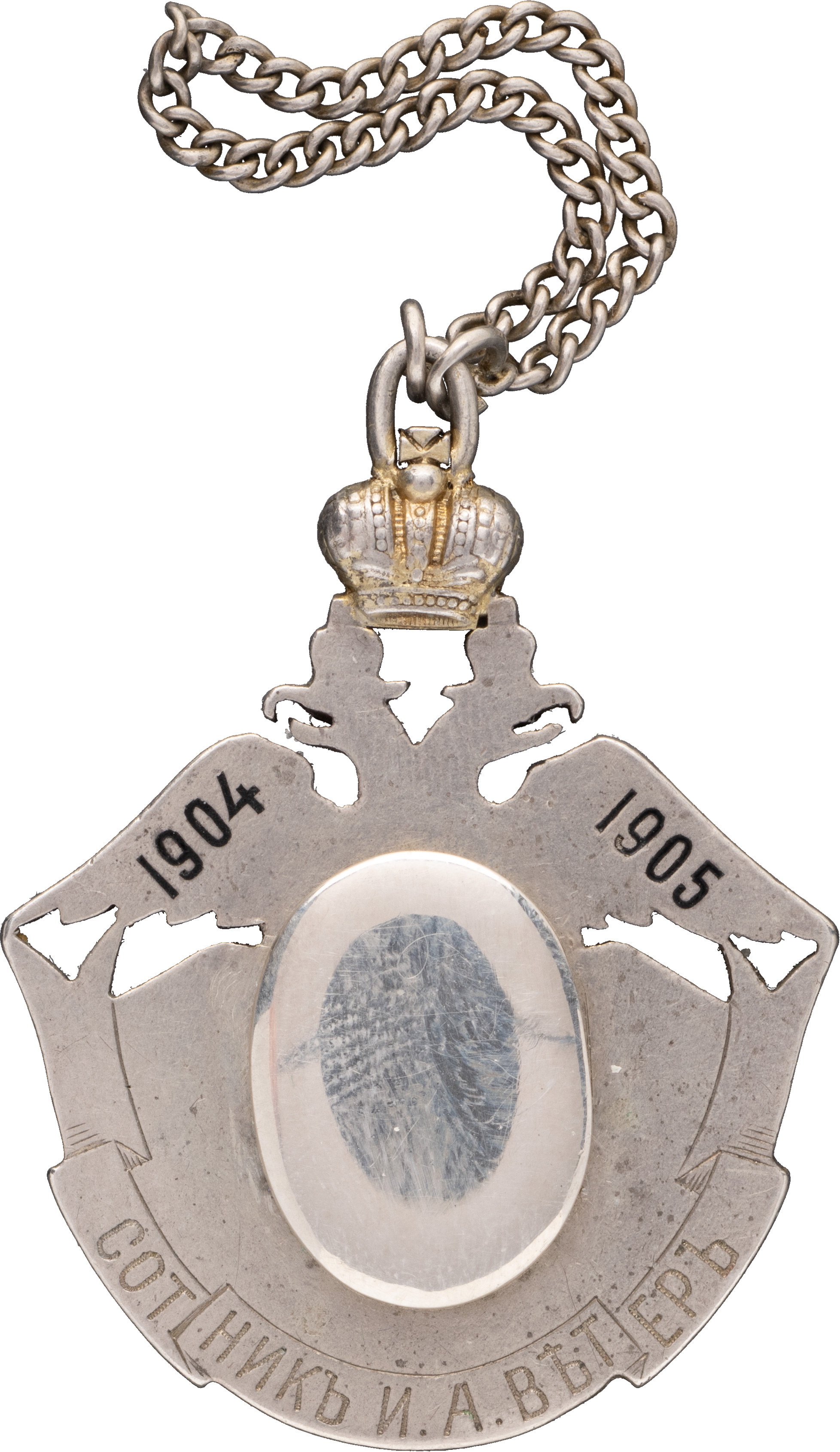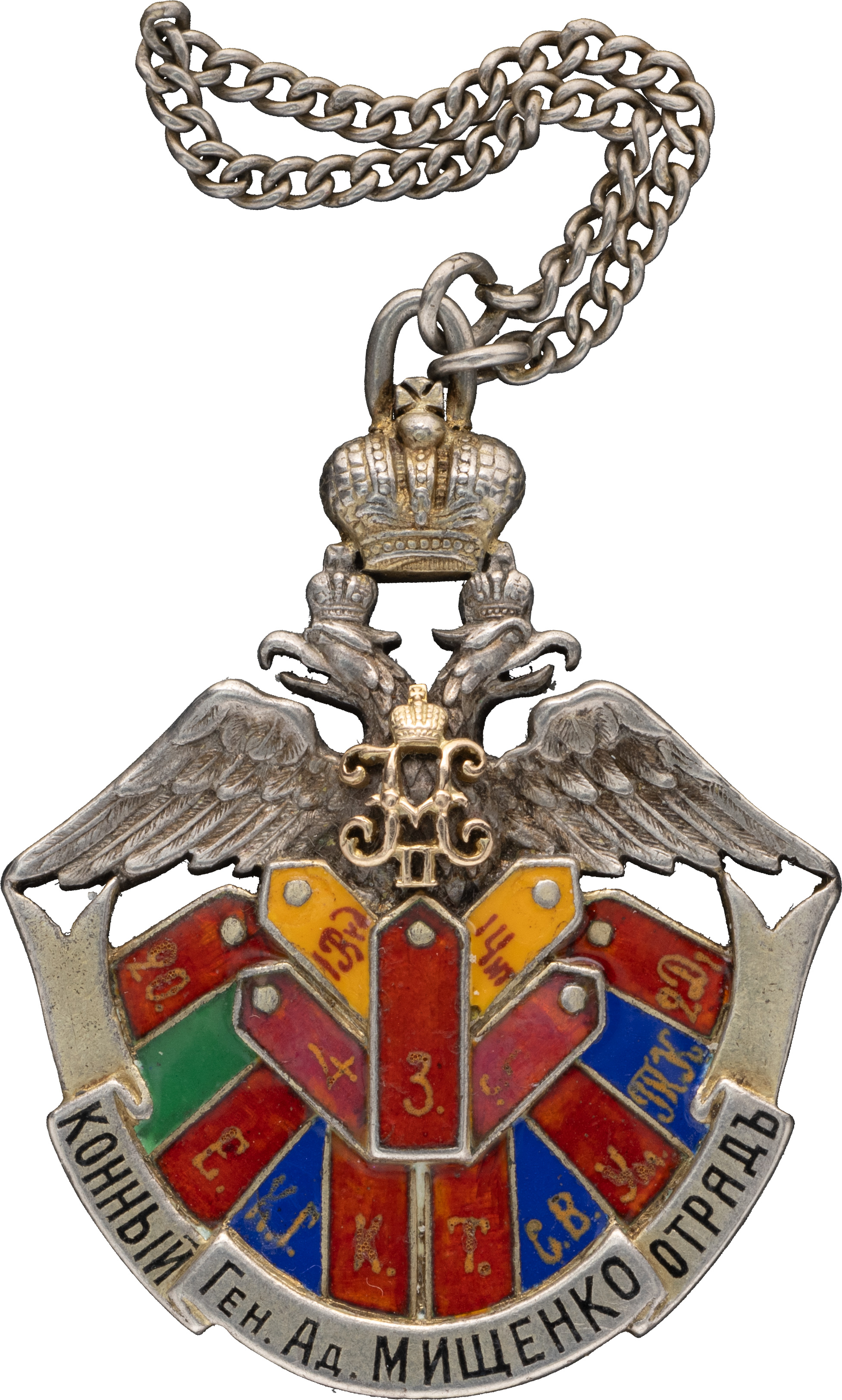 Жетон Конного отряда генерал-адъютанта Мищенко. Российская Империя, 1905 г. Неизвестная мастерская. Без клейм. Серебро, позолота, оксидирование, золото, эмаль, 24,44 г. Размеры 47,2×35,7 мм. Сохранность почти отличная, небольшие поверхностные сколы на эмали. Принадлежал И.А.Ветру. Гравировка на об. ст. жетона внизу по окружности: «СОТНИКЪ И.А.ВѢТЕРЪ». Аналогичный жетон опубликован в издании: Werlich R. Jettons of Imperial Russia. Washington, 1985. P. 29. Fig. J-45. Очень редкий.