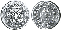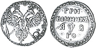 Гривенник 1701 г. Новодел. Лиц. ст.: ГРИ-ВЕННИК. Об. ст.: написание даты по III варианту, ЯЧ’Я. Серебро. Сохранность VF-XF. Узд#0436Н (•). Severin#26А (черта с точкой).