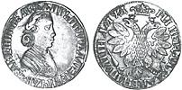 Деньга 1701 г. Лиц. ст.: ЦРЬ I ВЕЛИКIЙ КНЗЬ ПЕТРЬ АЛЕ3IЕВИЧЬ. корона большая, разделяет надпись. Об. ст.: вверху розетка. Медь. Сохранность F-VF. Узд#2257.