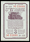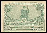 Первый выпуск 1926 года. 50 копеек, серия 005, № 06442. Сохранность очень хорошая, небольшое отверстие-разрыв в правом нижнем углу билета.