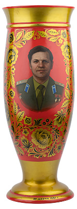 Ваза напольная с изображением летчика-космонавта А.А. Губарева, в память 50-летия со дня его рождения, 29 марта 1981 г. СССР. Дерево, хохломская роспись масляными красками, лак. Диаметр (по горлышку) 270 мм, высота 700 мм. К вазе прилагается фотография А.А. Губарева с членами семьи в домашнем интерьере от 21.04.1987 г. (на фото видна представленная ваза). Сохранность вазы почти отличная, фотографии - очень хорошая. Интересные и редкие артефакты.