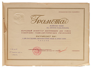 Грамота Народного Комиссариата внутренних дел СССР о награждении младшего лейтенанта милиции Степана Матвеевича Харитонова часами. Москва, 31 декабря 1937 г. С подписью зам. Народного комиссара внутренних дел СССР комдива В.В. Чернышёва. Размеры 278×380 мм. Сохранность почти отличная, небольшие загрязнения и утраты поля обложки.