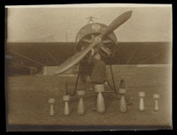 На фотооткрытке изображен аппарат «Моран Ж», перед ним на земле – бомбы разного калибра: 10-фунтовая, 25-фунтовая, 1-пудовая и 2-пудовая. На этом аппарате военный летчик 4-го корпусного авиаотряда поручик Александр Александрович Козаков в марте 1915 г. одержал свою первую победу.
