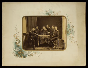 Российская Империя, 1899-1904 гг. Неизвестное фотоателье. Размеры без паспарту: 177 х 181 мм, 182 х 179 мм. Размеры паспарту: 350 х 470 мм. Сохранность почти отличная. Надпись на паспарту под фотографиями: «Знамя находилось въ полку въ кампанiи 1877-78 г.г., при чемъ было въ сраженiяхъ / при д.д. Аблаво 24 Августа, Трестеники и Мечки 14 и 30 Ноября.». Довольно редкие.
