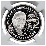 Банк России. 150 рублей 1993 года, ЛМД, Россия и мировая культура, И. Ф. Стравинский. Платина. Монета в пластиковой капсуле (слабе) ННР, PF 70. Рылов, Соболин# С.465.