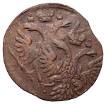 Деньга 1766 года, ЕМ. Лиц. ст.: корона по центру вензеля.