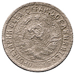 15 копеек 1931 года. Лиц. ст.: шт. 1.2 — три параллели. Об. ст.: шт. А — щит придвинут к канту. Мельхиор, 2,43 г. Сохранность удовлетворительная, сильная коррозия. ФедоринVI# 50. Очень редкие.