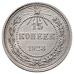 15 копеек 1923 года. Лиц. ст.: шт. 1.2 — у колоска слева от герба пять остей. Серебро, 2,67 г. Сохранность почти отличная, чистка. ФедоринVI# 4.