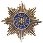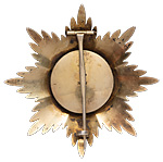 С.-Петербург, конец 1870-х - начало 1880-х гг. Фирма «Кейбель». Клейма: на об. ст. звезды - проба металла «84» с городским клеймом С.-Петербурга, Государственный герб и клеймо фирмы «Keibel»; на булавке с внутренней стороны - такие же три клейма. Серебро, позолота, эмаль, 46,41 г. Размеры 87,0 х 87,7 мм. Сохранность почти отличная, небольшие сколы эмали на накладном кресте, красивая патина. Довольно редкая.