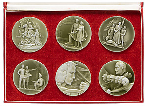 ММД, 2000 г. Автор общего дизайна серии А.В. Бакланов. Томпак, чеканка качества «пруф». Диаметр медалей 39 мм (14 шт.) и 50 мм (заглавная медаль). Сохранность отличная, медали вложены в пластиковые капсулы и подарочную коробку с тиснением на крышке заглавной надписи. Набор снабжен сертификатом подлинности №171. Тираж 400 комплектов.