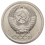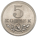 5 копеек 1953 года. Пробные. Лиц. ст.: тип II — буквы СССР под гербом в одну строку. Об. ст.: тип IIа — цифры даты под серпом и молотом, «5» номинала тонкая. Гурт рубчатый. Медно-цинково-никелевый сплав, 5,34 г. Сохранность отличная, красивый штемпельный блеск. Ушаков, Федорин# 79 (Р-5). ФедоринVI, Приложение 6, С.473.9. Крайне редкие. Пробные экземпляры с таким видом оборотного штемпеля крайне редки!
