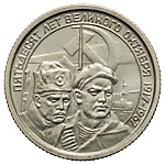 15 копеек 1967 года, 50 лет Советской Власти. Пробные. Штемпели лицевой и оборотной стороны оригинального неутвержденного рисунка. Гурт рубчатый. Медно-никелевый сплав, 2,69 г. Сохранность отличная, штемпельный блеск. Ушаков, Федорин# 443 (реверс 2), Р-5. ФедоринVI, Приложение 6, Дополнение, С. 462.5. Крайне редкие. Пробные монеты юбилейной серии «Пятьдесят лет Советской Власти» крайне редки.