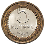 5 копеек 1990 года (ЛМД). Опытный экспериментальный образец: чекан на составной биметаллической заготовке: ободок — медно-цинковый сплав, вставка — медно-никелевый сплав, 4,77 г. Гурт рубчатый. Сохранность отличная, штемпельный блеск. Крайне редкие.