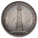 1 рубль 1839 года, Н. GUBE F. Чеканен по случаю открытия памятника на Бородинском поле. Серебро, 20,57 г. Сохранность очень хорошая, мелкие царапины, дефект кромки гурта. ГМ# 18.8. Severin# 3303 (черта). Уздеников# 4192 (точка). Биткин# 895 (R). Довольно редкий, 2 рубля 25 копеек по Петрову.