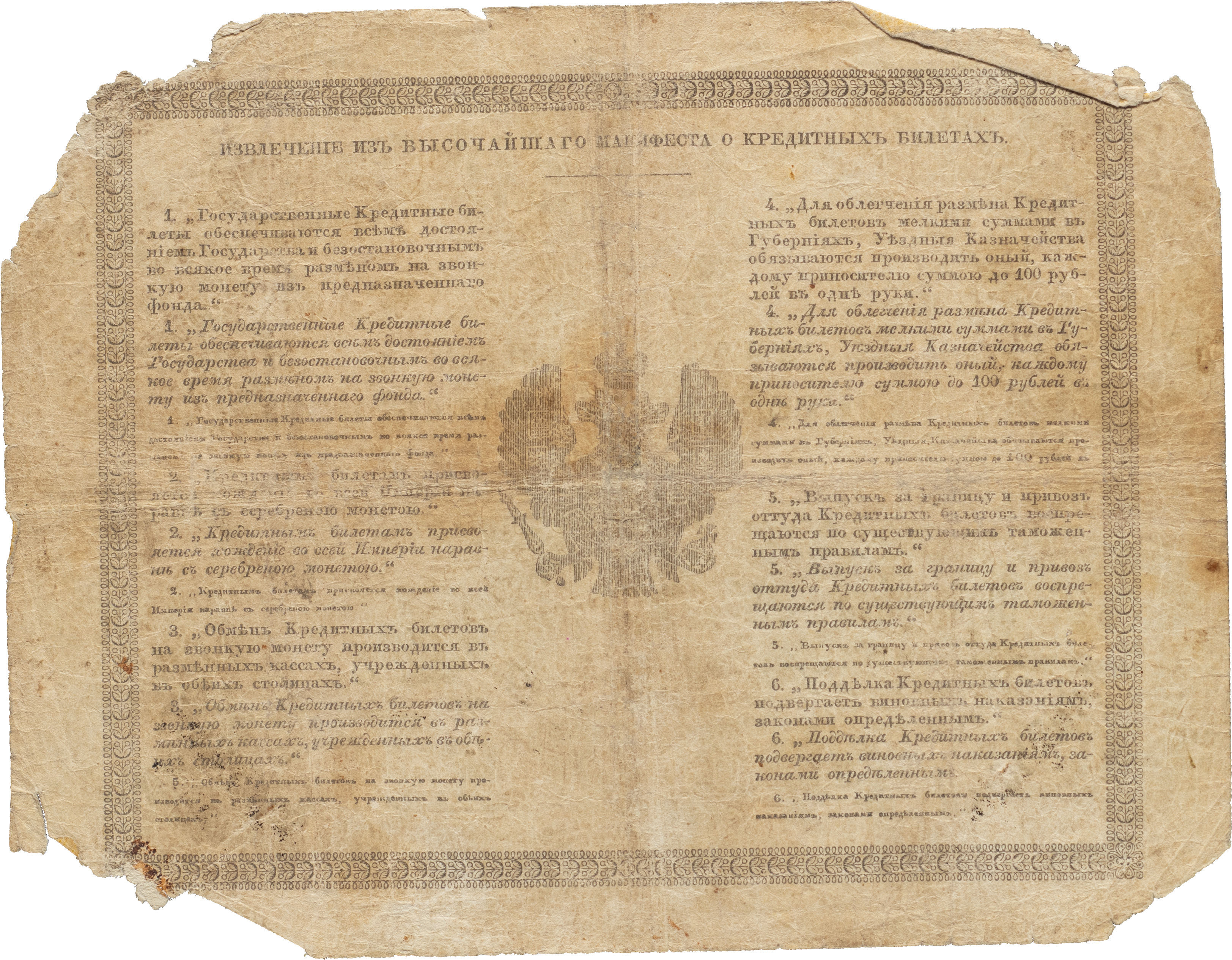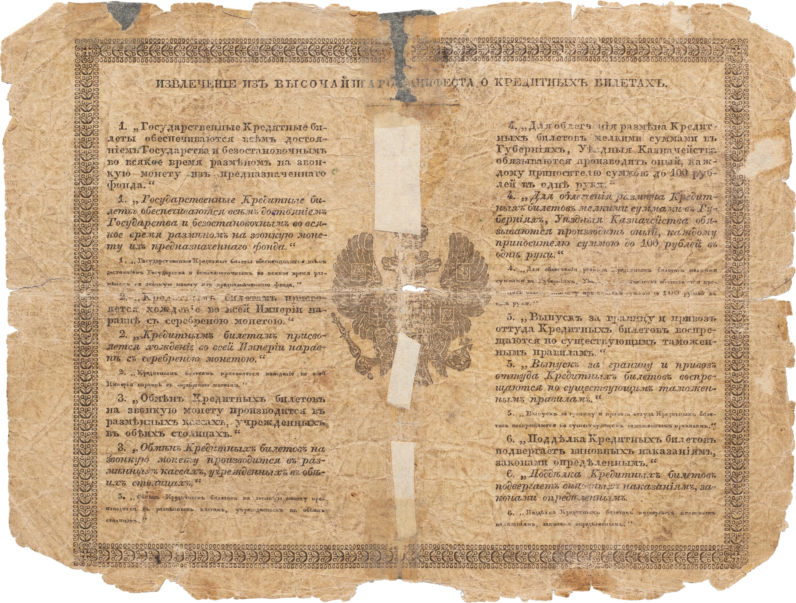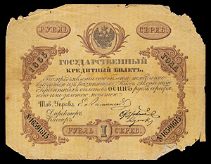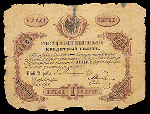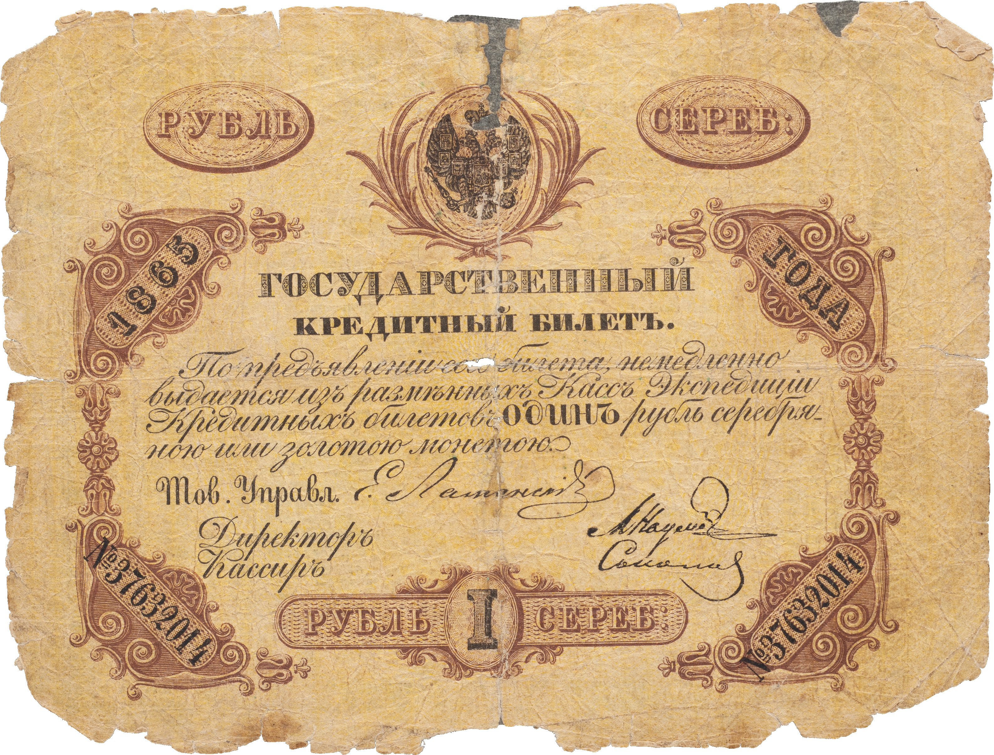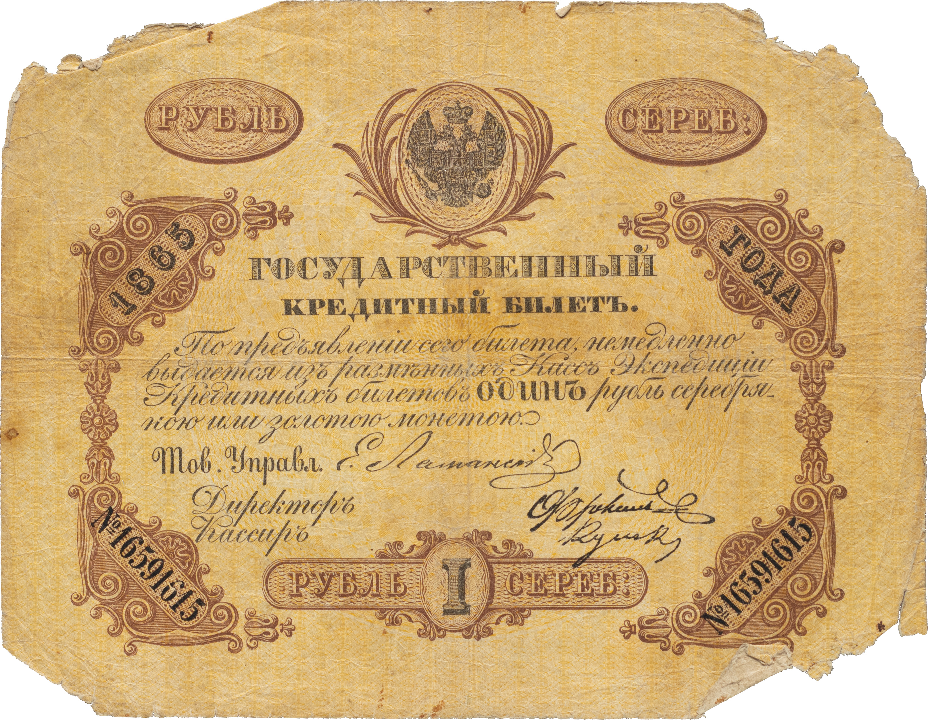 Государственный Кредитный Билет 1 рубль 1865 года, № 37632014. Сохранность удовлетворительная, склейки. Кардаков# I.1.513 (4 дойчмарки). Денисов# К-1.15. Рябченко# 445. Довольно редкий.