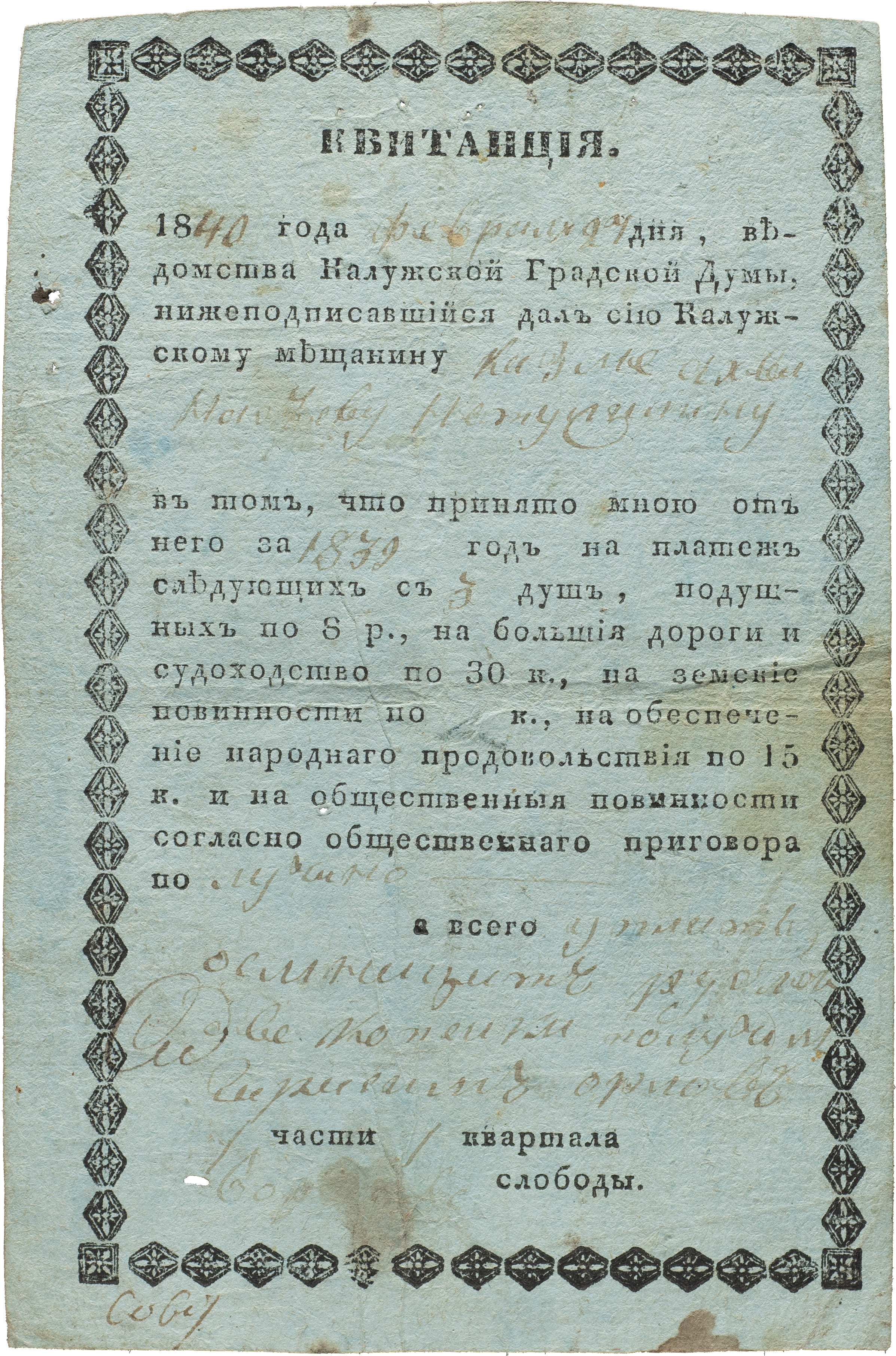 Калужская Городская Дума. Квитанция на сумму 18 рублей 2 копейки 1840 года