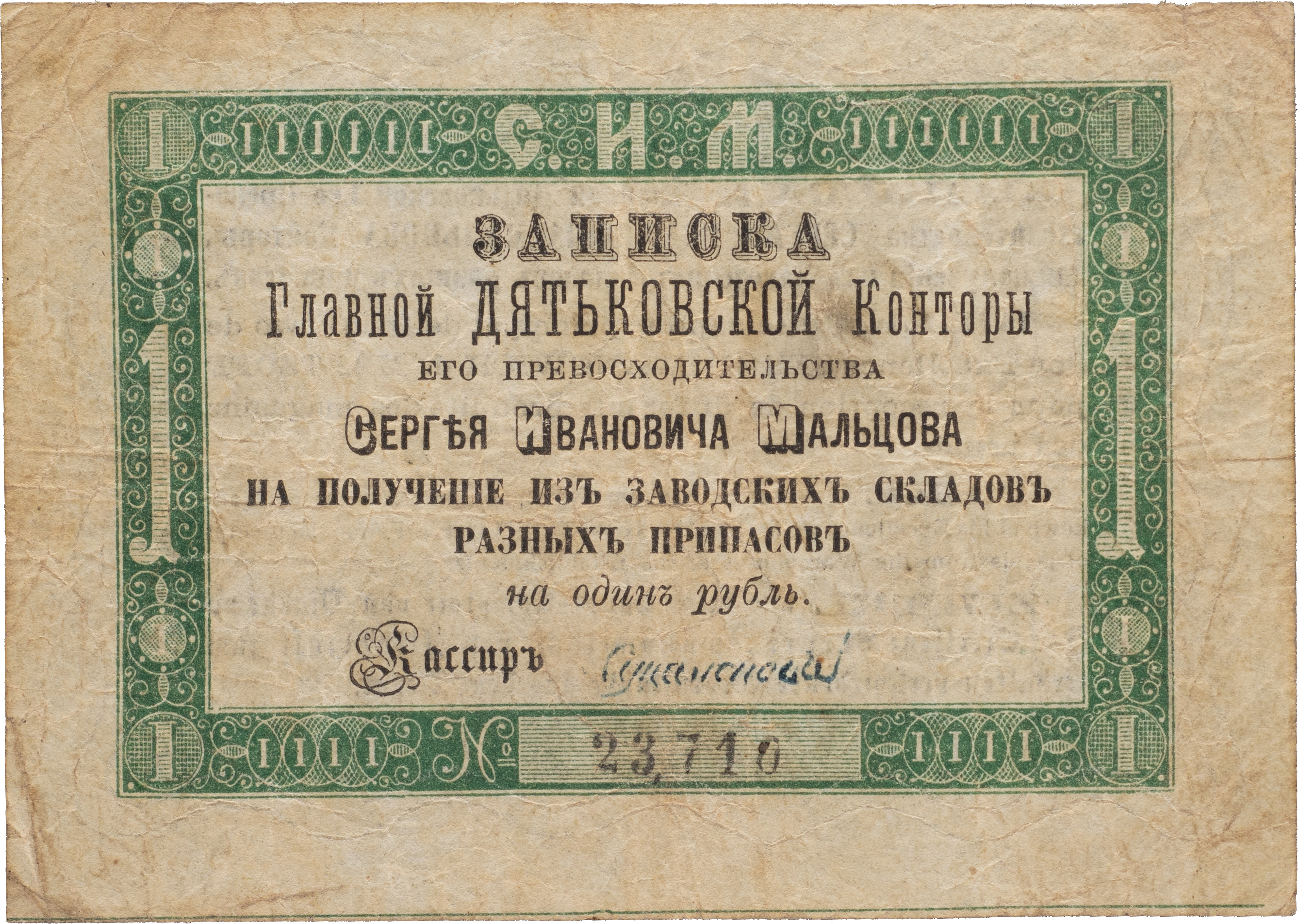 Главная Дятьковская Контора Его Превосходительства Сергея Ивановича Мальцова, Орловская губерния Брянской области. Записка на 1 рубль (1867–1868 гг)