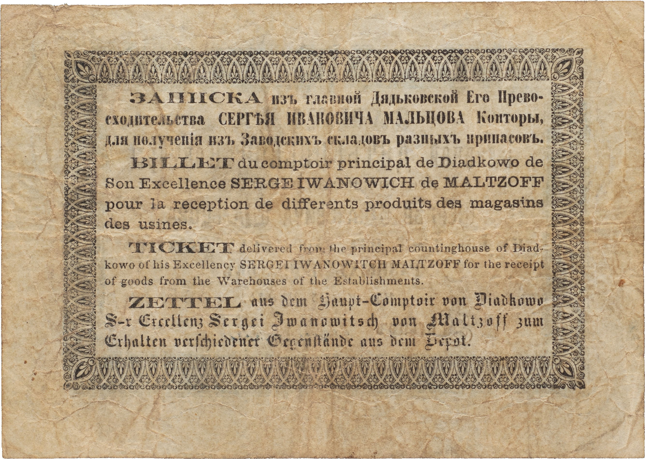 Главная Дядьковская Контора Его Превосходительства Сергея Ивановича Мальцова, Орловская губерния Брянской области. Записка на 1 рубль серебром (1860–1868 гг), № 37.118. С надписью на обороте на русском, французском, английском и немецком языках. С подписью кассира, текст в овале, цвет рисунка зеленый. Сохранность очень хорошая. Денисов# ЗМ-4.3. Рябченко# 3110, вар. Очень редкая.
