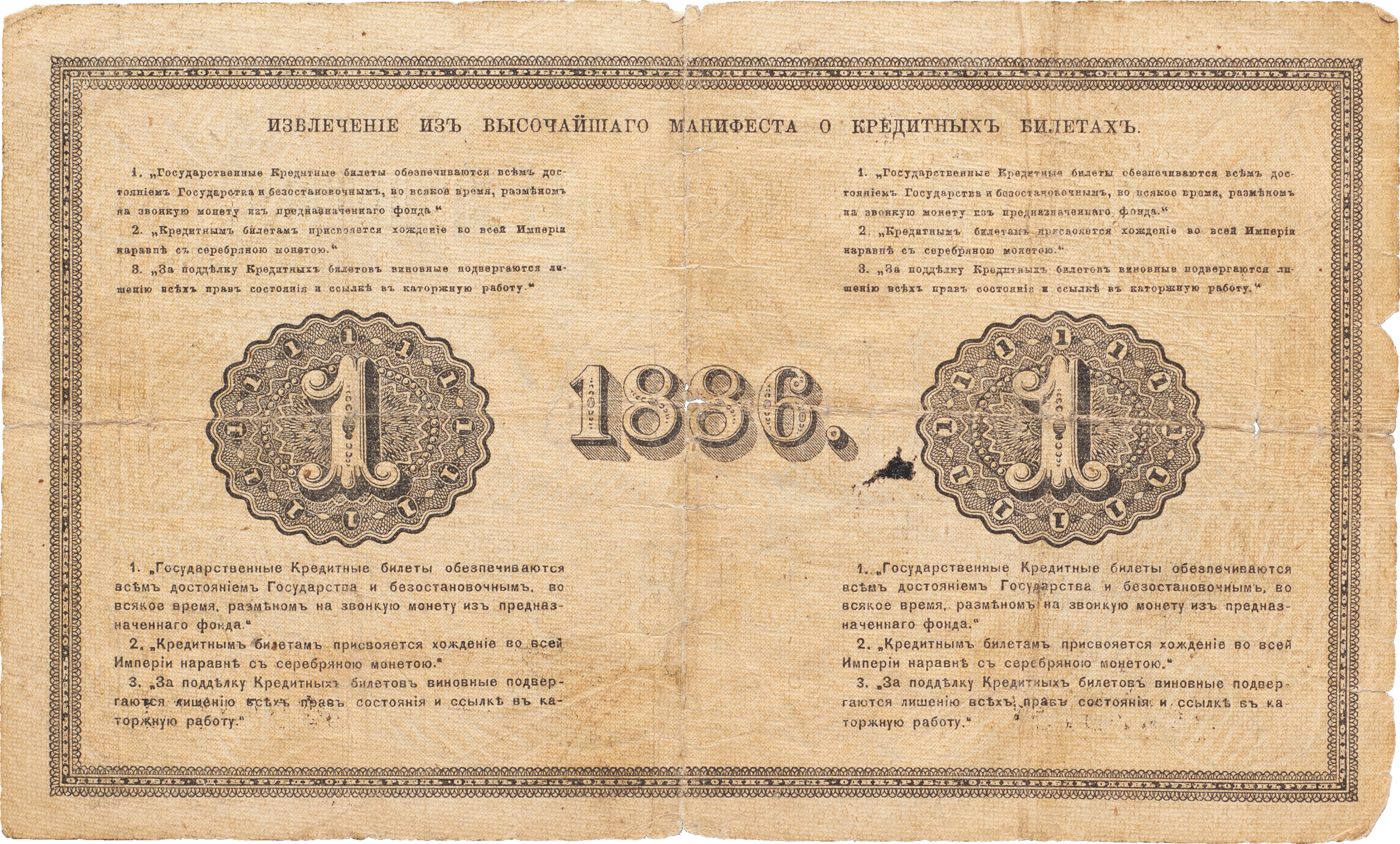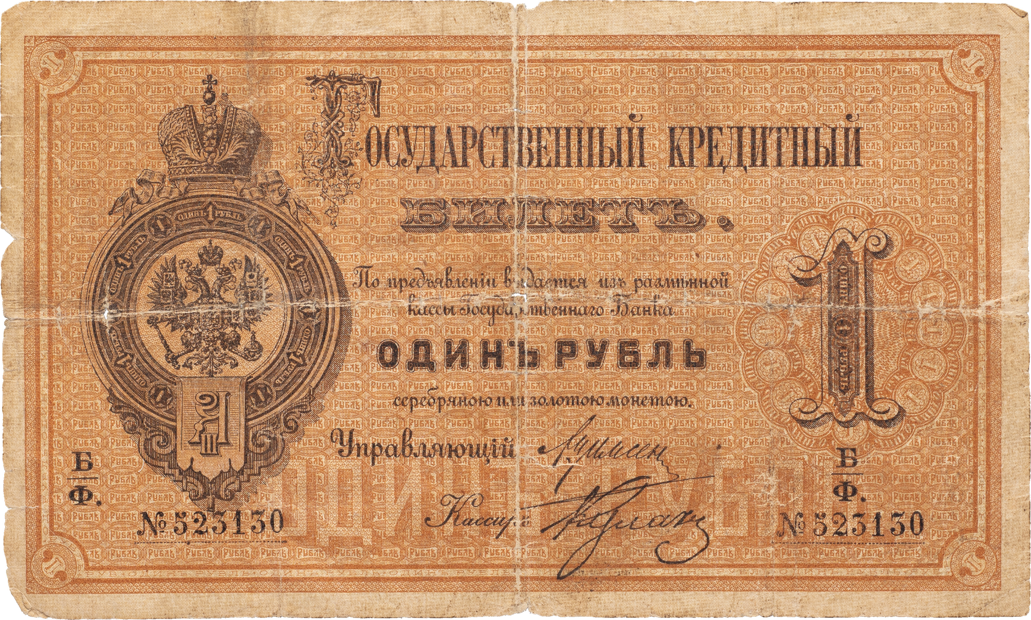 Государственный Кредитный Билет 1 рубль 1886 года, Б/Ф. № 523130. Сохранность очень хорошая. Кардаков# I.1.593 (2 дойчмарки). Денисов# К-8б.3. Рябченко# 522. Довольно редкий.