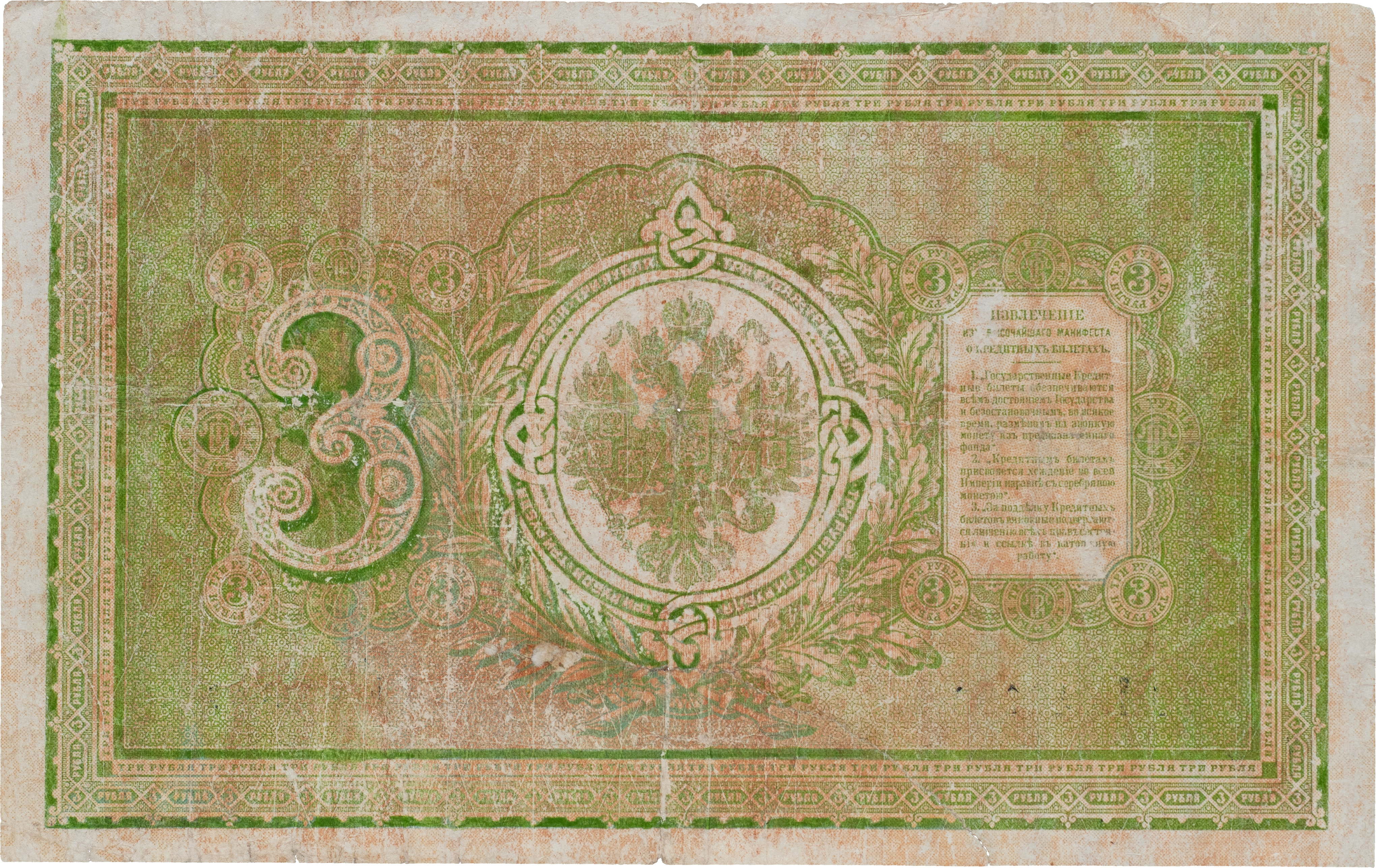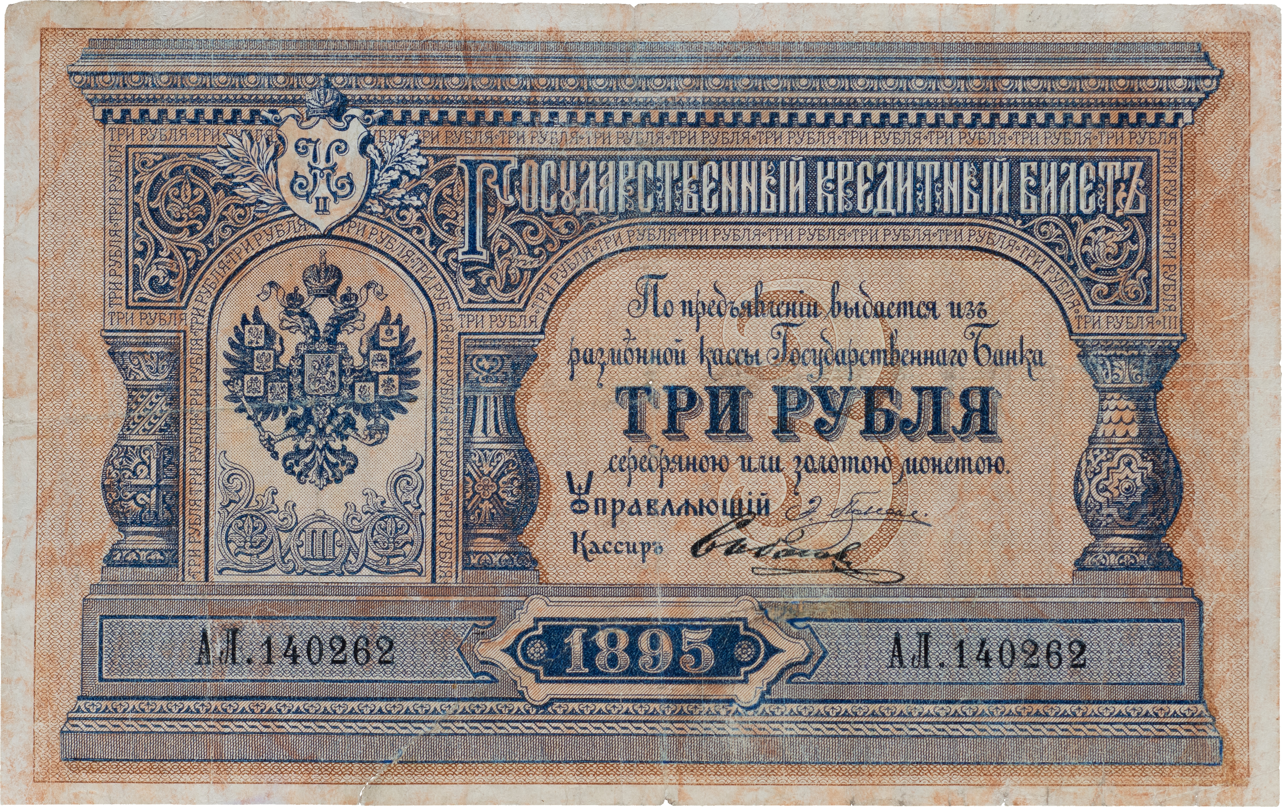 Государственный Кредитный Билет 3 рубля 1895 года, АЛ. 140262. С подписями управляющего Э. Плеске, кассир Соболев. Сохранность очень хорошая. Кардаков# I.1.655. (3 дойчмарки). Денисов# К-16б.1. Рябченко# 564. Довольно редкий.
