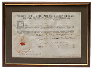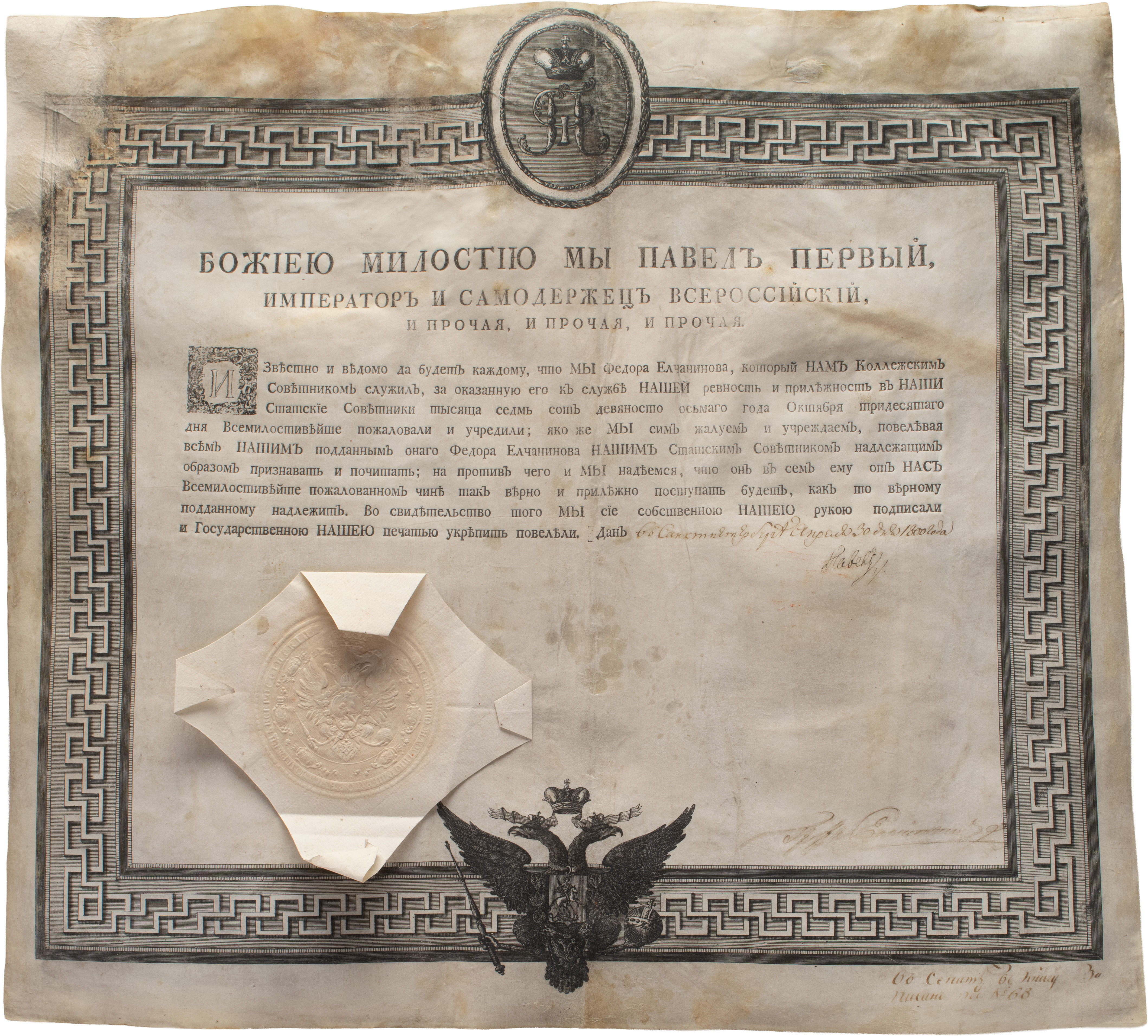 Патент Федора Елчанинова на чин статского советника. Подписи Императора Павла I и NN (автографы). Государственная печать. С.-Петербург, 30 апреля 1800 г. Бумага, чернила, сургуч; печать типографская, рукопись. Патент оформлен в декоративную картонную раму. Размеры: патента 457×507 мм, рамы 655×710 мм. Сохранность очень хорошая, следы влаги, сургуч частично утрачен. Редкий.