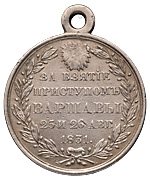 Учреждена 31 декабря 1831 г. именным указом Императора Николая I, данным управляющему Главным Штабом. Медалью награждали генералов, офицеров, солдат, медицинских чиновников и священников, принимавших участие в штурме г. Варшавы 25–26 августа 1831 г. Представления о награждении медалью принимались до 1 января 1843 г. Рисунок медали был утвержден Императором Николаем I 25 сентября 1831 г.