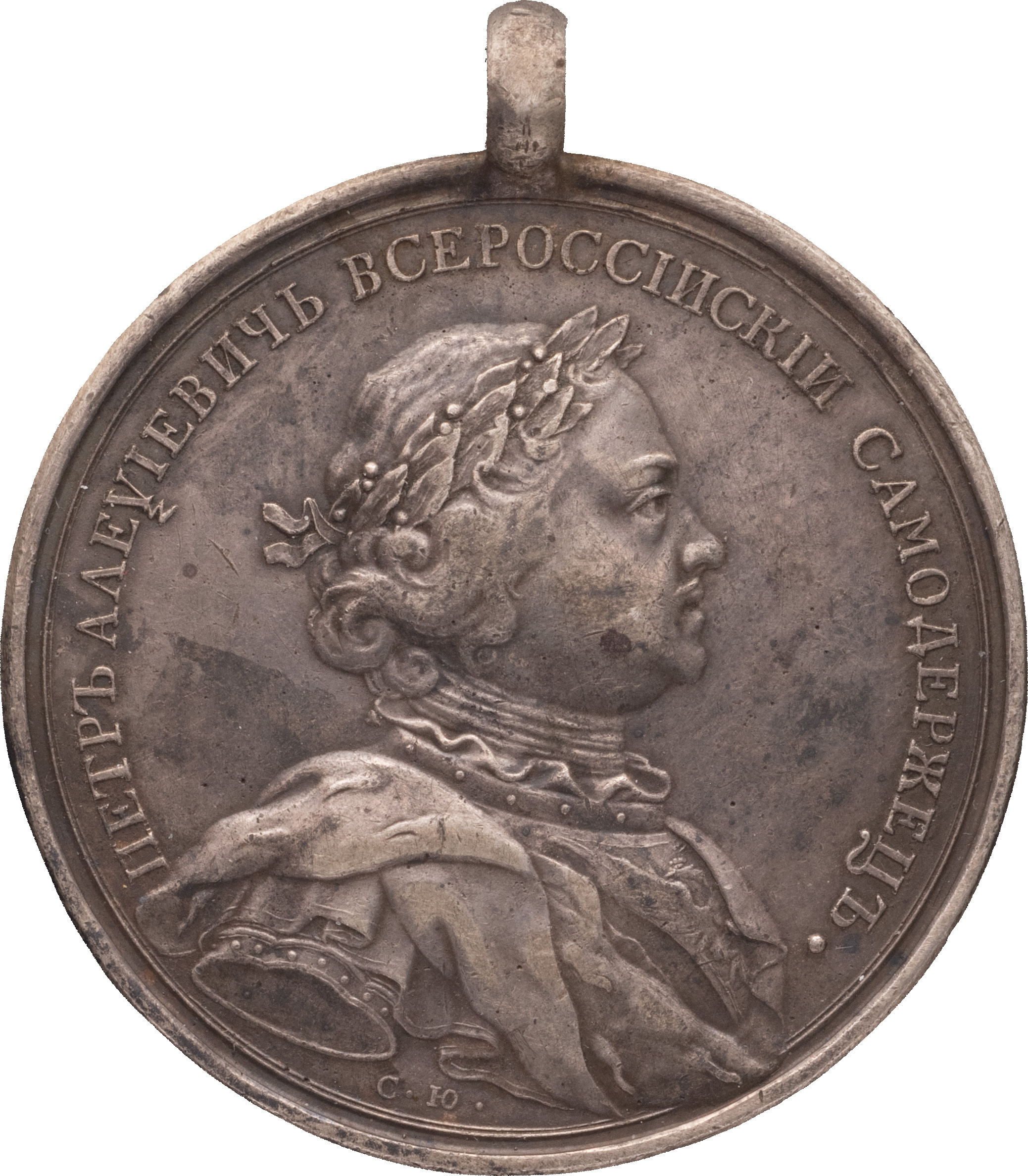 Наградная унтер-офицерская медаль за сражение при Полтаве, 27 июня 1709 г., новодел. СПб монетный двор, середина XVIII в. Медальеры: лиц. ст. — С.Ю.Юдин (внизу на поле: С·Ю·), об. ст. — Б.Скотт (слева над линией обреза изображения: B·SCOTT· F). Серебро, 55,09 г. Диаметр 47,4 мм. Сохранность очень хорошая, красивая патина, вверху медали припаяно ушко. Иверсен# XXIV.1.а. Смирнов# 182. Дьяков# 27.2 (R1). Соколов# 060.а.2.К. Великие Русские победы в медали и гравюре, 1709. # 301–305. Биткин (медали)# К170 (R3). Редкая.