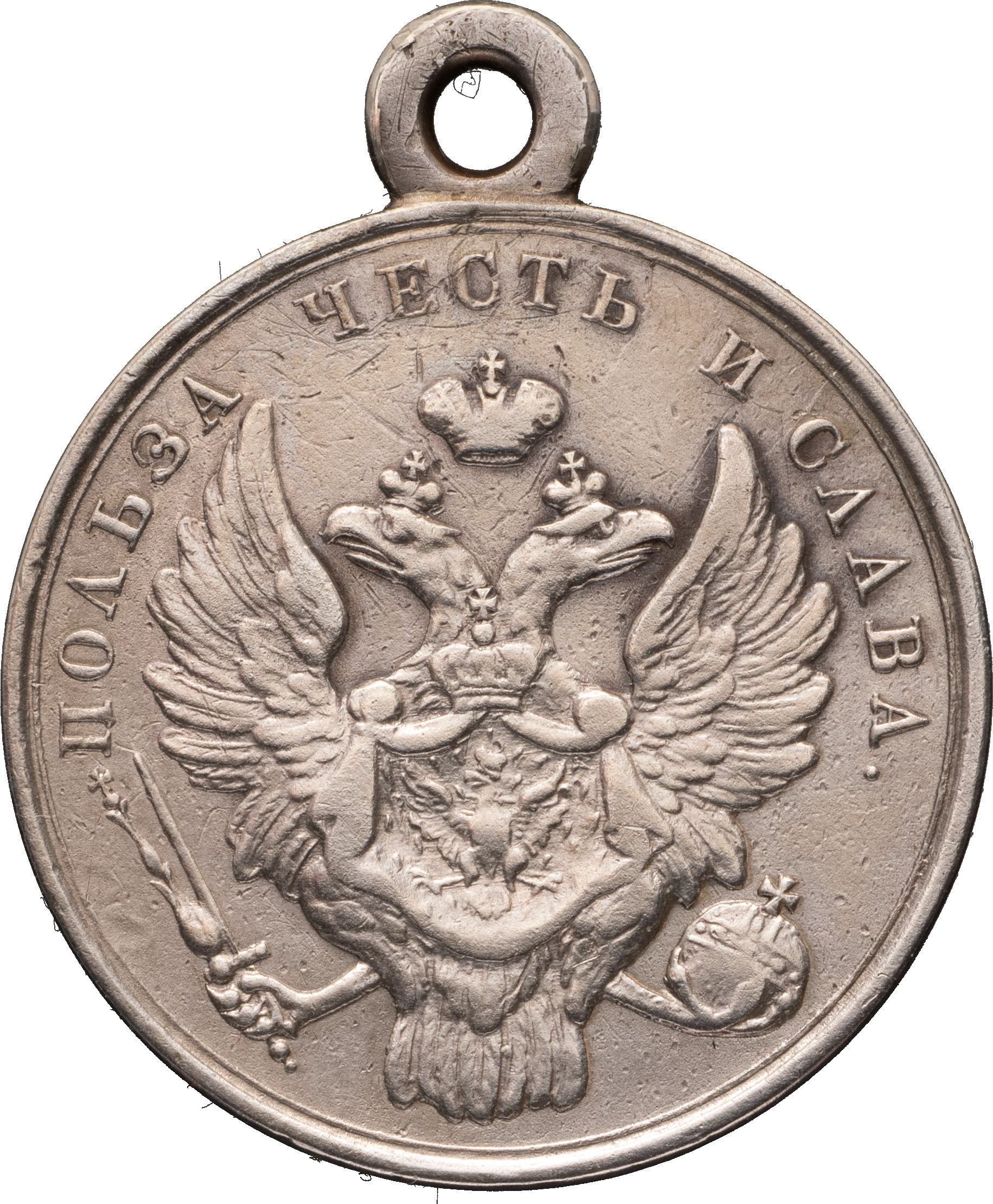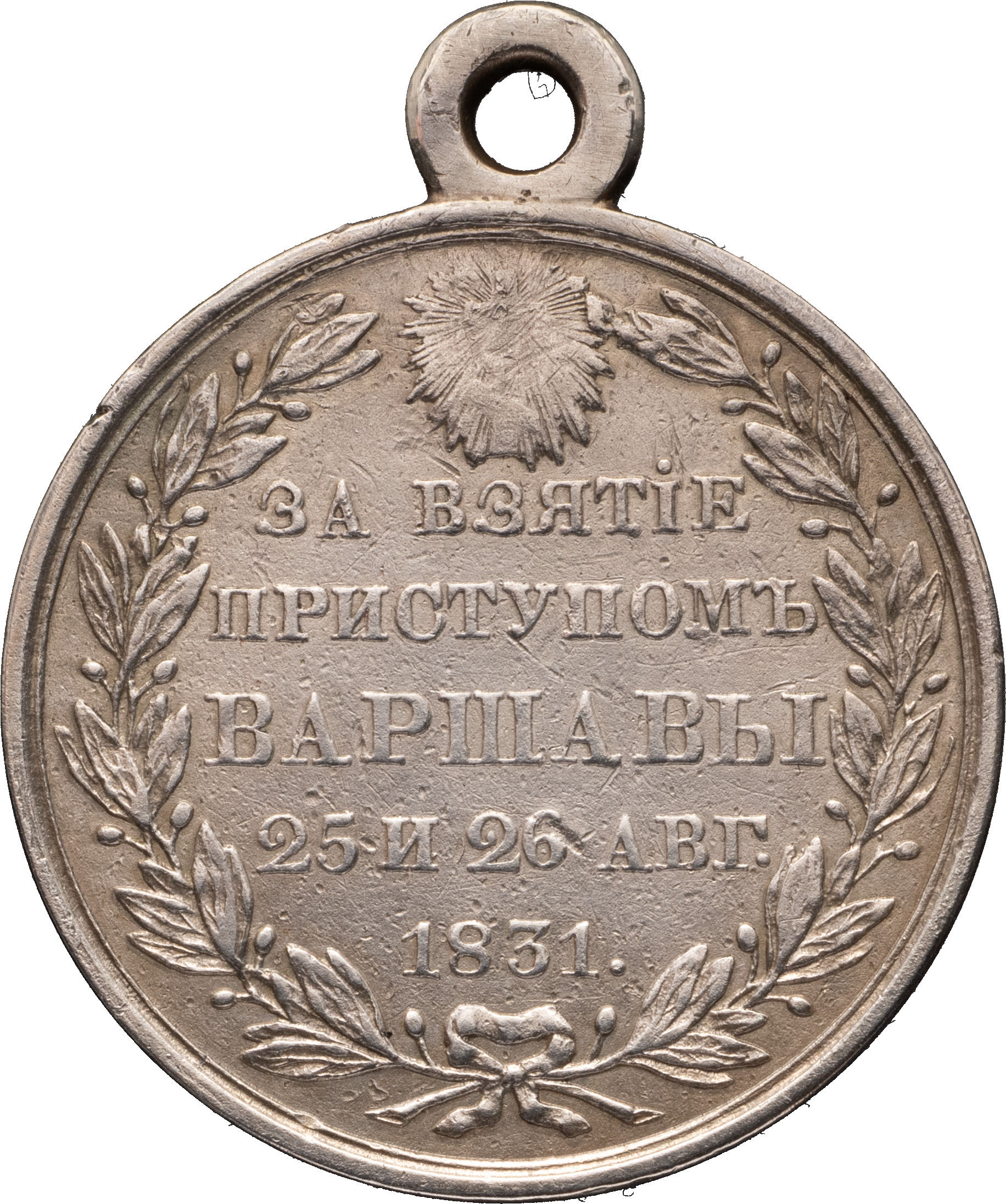 Медаль «За взятие приступом Варшавы». СПб монетный двор, 1830-е гг. Серебро, 9,36 г. Диаметр 26,1 мм. Сохранность очень хорошая, ушко восстановлено. СРМ# 373. Смирнов# 464/б. Петерс# 94. Дьяков# 498.2 (R1). Биткин# 825.Б (R2). Редкая.