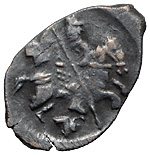 Лжедмитрий I (1605–1606 гг.). Копейка 1605–1606 гг. с именем Дмитрия Ивановича. Псковский денежный двор. Лиц. Ст.: буквы «ПС» под всадником. Серебро 0,67 г. Сохранность очень хорошая, тёмная патина.