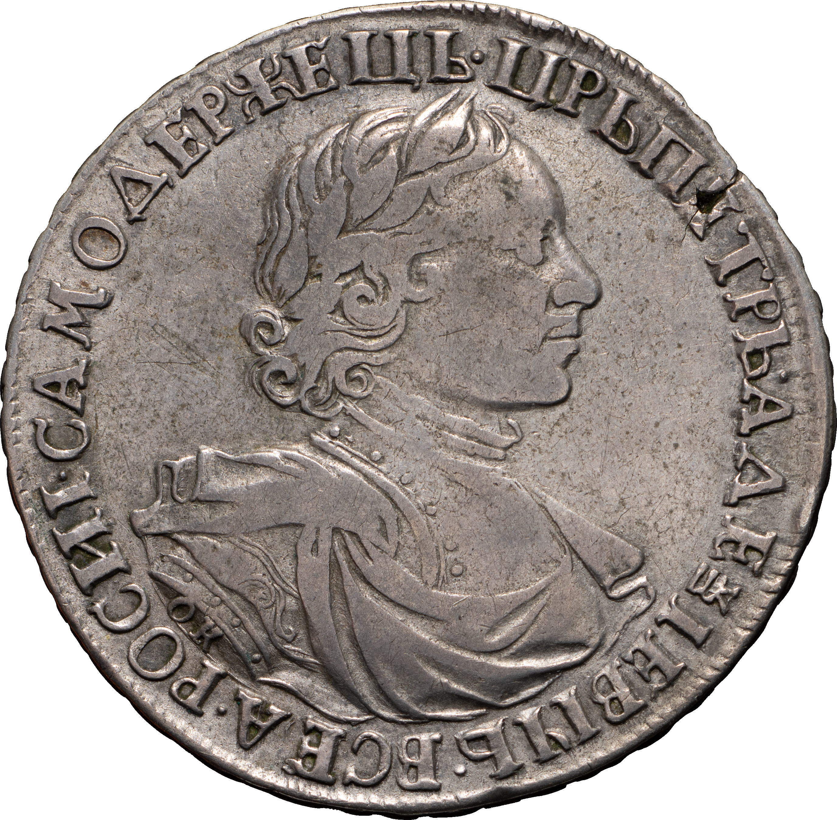 1 рубль 1719 года, ОК-L. Лиц. ст.: портрет без арабесок на груди, на груди ряд заклепок. Об. ст.: «МОНЕТА», буква «L» на груди орла. Гурт: «IБЛЕВИKЪ:МАНЕТНАГО ДЕНЕЖ LНАГО*ДВОРА**1719 ****». Серебро, 28,19 г. Сохранность почти отличная, приятная патина, царапины. ГМ# 99.2. Severin# 418 (точка). Уздеников# 0575. Дьяков# 74. ДьяковЗС# 751 (R1). Биткин# 279 (R). Редкий, 5 рублей по Петрову.
