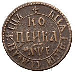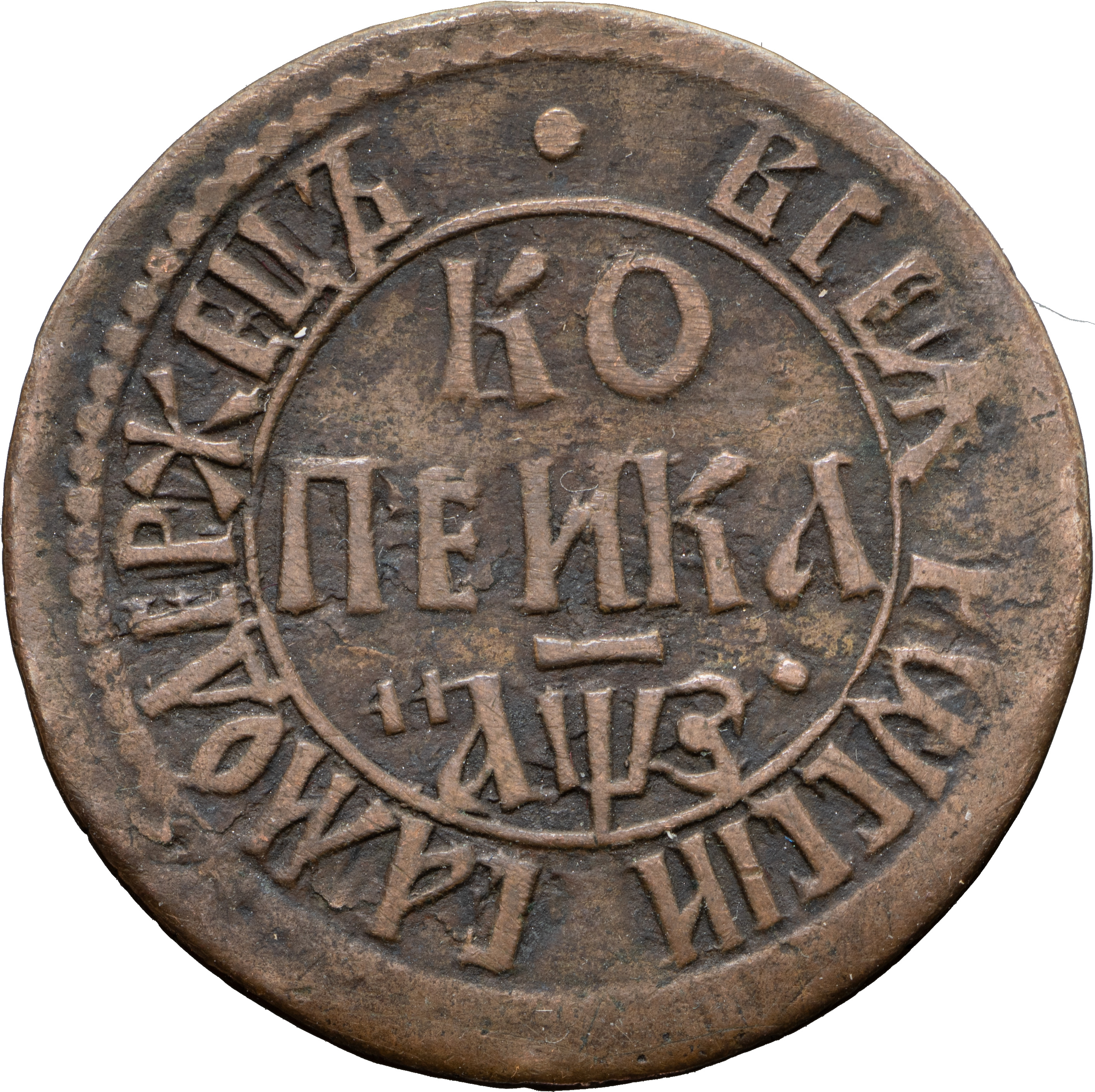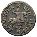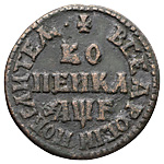 1 копейка 1705 года, МД. Лиц. ст.: вверху розетка, ножка буквы «М» усечена. Об. ст.: вверху точка слева от креста, в обозначении даты буква «Е» в виде «F». Медь, 8,69 г. Сохранность очень хорошая, темная рыхлая патина, царапина. ГМ# 23.36. Brekke# 166. Уздеников# 2273. Дьяков# 78. ДьяковММ# 2072 (R0). Биткин# 3313.