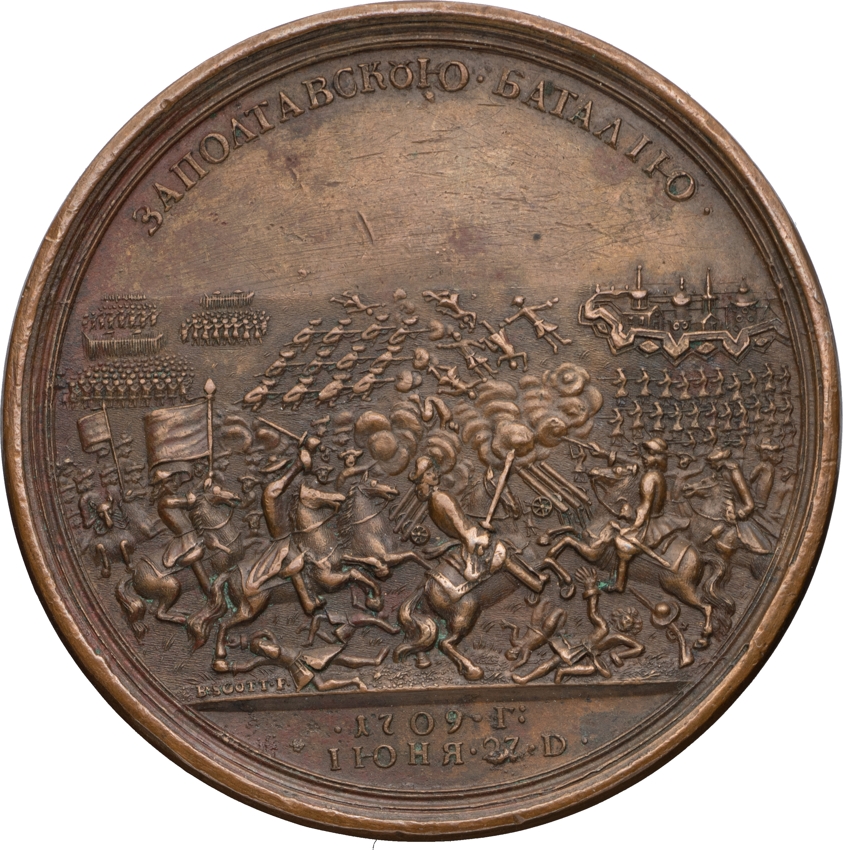 Наградная унтер-офицерская медаль за сражение при Полтаве, 27 июня 1709 г., новодел. СПб монетный двор, середина XVIII в. Медальеры: лиц. ст. — С.Ю. Юдин (внизу на поле: С·Ю·), об. ст. — Б. Скотт (слева над линией обреза изображения: B:SCOTT·F·). Бронза; 58,73 г. Диаметр 51,3 мм. Иверсен# XXIV.1.а. Смирнов# 182. Дьяков# 27.2. Соколов# 060.а.2.К (R). Великие Русские победы в медали и гравюре, 1709. # 301–305. Биткин (медали)# К170 (R). Сохранность очень хорошая. Довольно редкая.