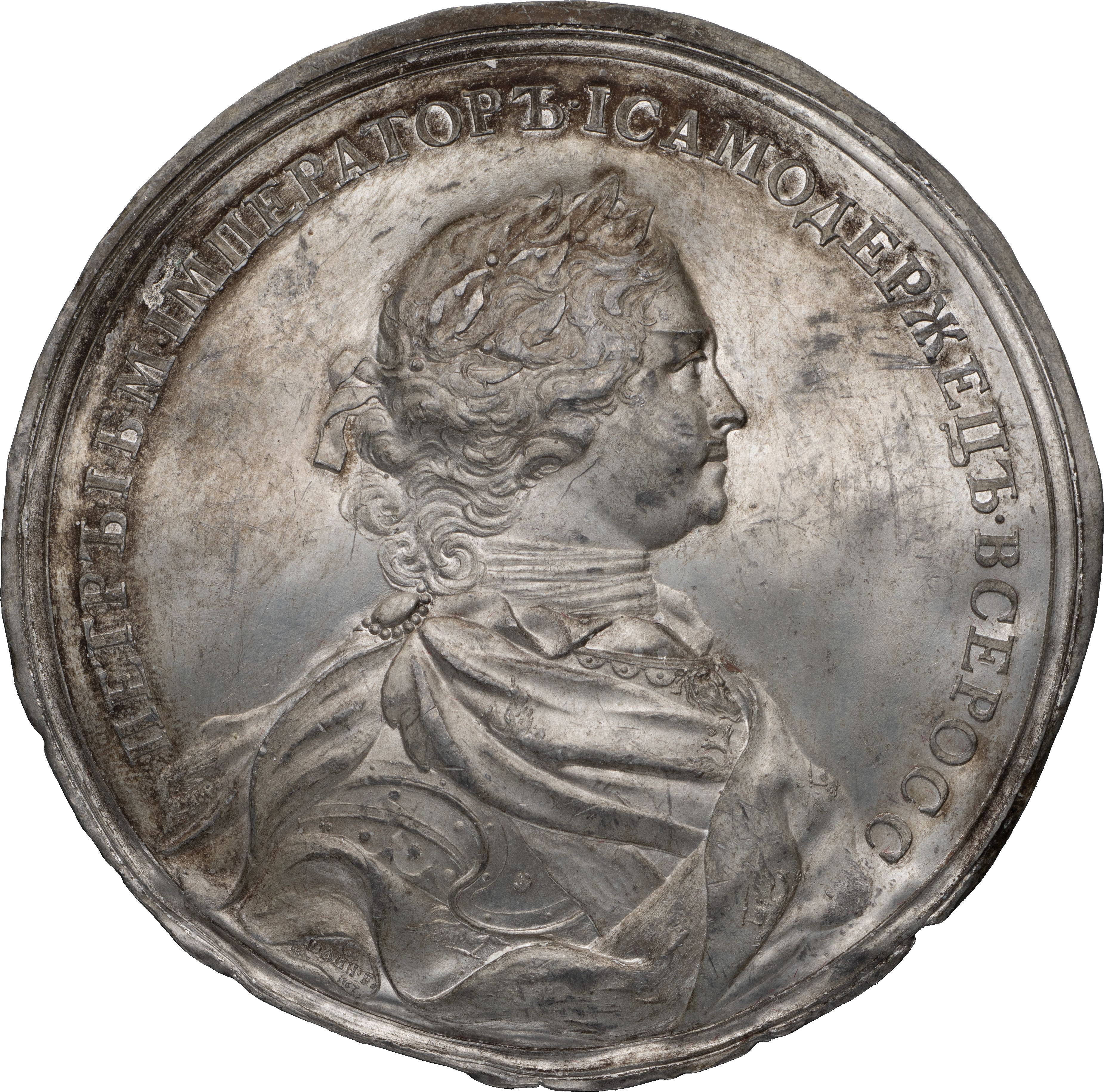 Медаль в память основания С.-Петербурга, 16 мая 1703 г., из серии медалей на события Северной войны. СПб монетный двор. Медальер С.Ю. Юдин (лиц. ст. — на обрезе изображения: С.Ю., об. ст. — вблизи правой ноги Меркурия: Ю). Бронза; 53,27 г. Диаметр 47,7-48,0 мм (овальность). Иверсен# XVI.1.е. Дьяков# 18.8. Великие Русские победы в медали и гравюре# 25. Аналог см. Смирнов# 168. Сохранность почти отличная. Довольно редкая. Надписи на об. ст. медали (лат.): вверху — «HAEC FORTIA MCENIA CONDIT» (Основывает эти крепкие стены, хронограмма 1703), внизу под обрезом изображения — «PETRIBVRGI•PORTVS / ET NAVALE•» (Гавань и корабельная верфь Петербурга).