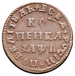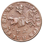 1 копейка 1705 года, МД. Лиц. ст.: вверху розетка, ножка буквы «М» усечена. Об. ст.: вверху точка слева от креста, в обозначении даты буква «Е» в виде «F». Медь, 8,55 г. Сохранность очень хорошая, приятная ровная сухая патина. ГМ# 23.36. Brekke# 166. Уздеников# 2273. Дьяков# 78. ДьяковММ# 2072 (R0). Биткин# 3313.
