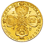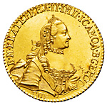 5 рублей 1763 года, СПБ. Новодел. Гурт косая насечка с наклоном вправо. Золото, 8,27 г. Сохранность отличная, приятный штемпельный блеск. ГМ# нет. Severin# N 260 (черта). Уздеников# Н 0107 (черта). Дьяков# Н 16 (R3). Биткин# Н 8 (R2). Очень редкие, 20 рублей по Ильину.