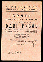 Арктикуголь Шпицбергенское рудоуправление. 1-й выпуск (1932 г.). Ордер для забора товаров на сумму 1 рубль н/д, № 016901. Водяной знак «ковер». Сохранность очень хорошая. Рябченко# 25163 (Р). Крайне редкий.